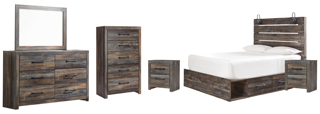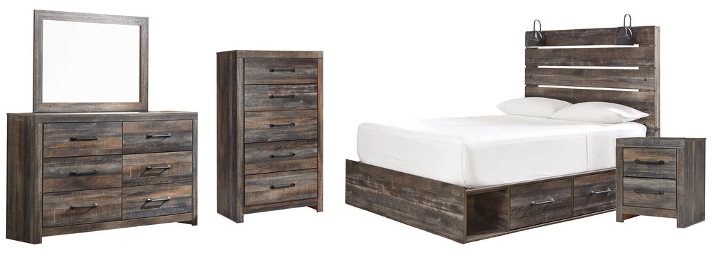 Drystan Queen Panel Bed with 2 Storage Drawers with Mirrored Dresser and Nightstand