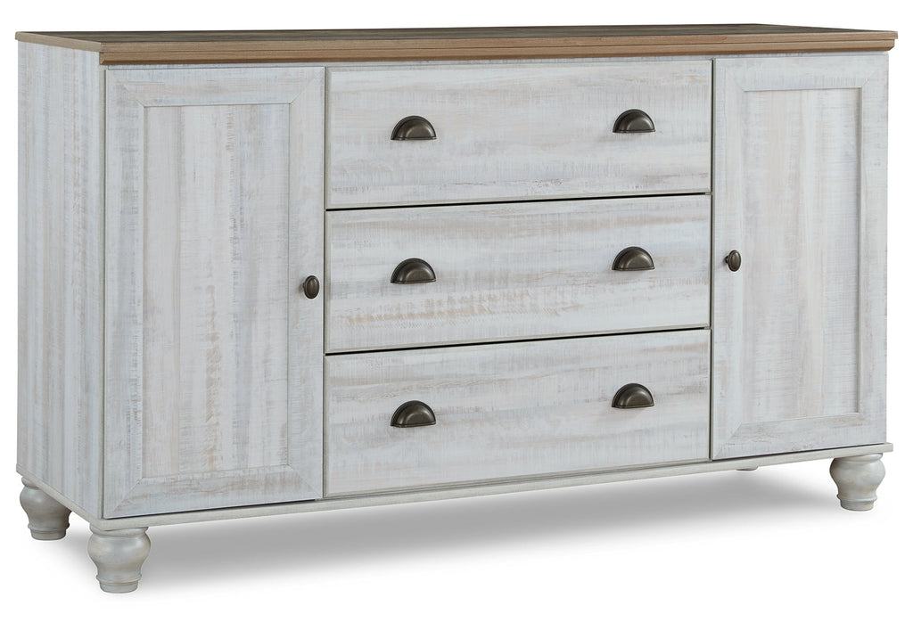 - 2-tone look (weathered white finish and replicated oak grain with authentic touch)