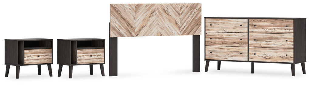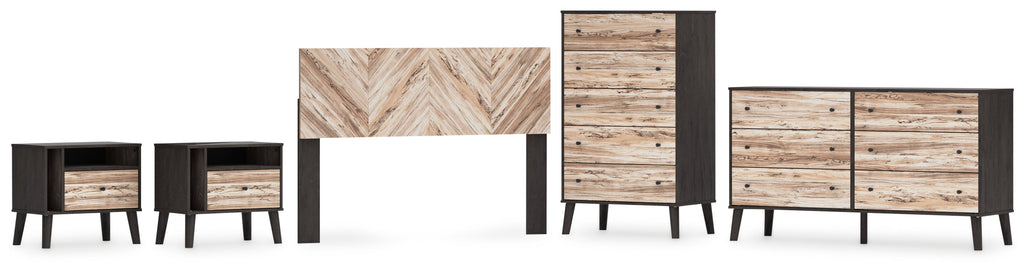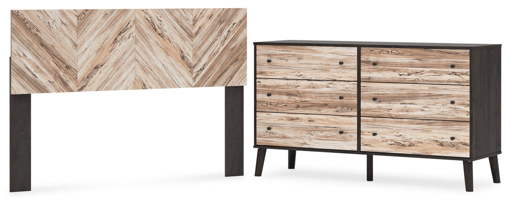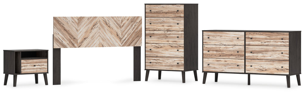The perfect marriage of contemporary and casual style, this bedroom package is a charming addition to your home. The set is expressive with its two-tone look, which pairs a solid matte white finish and a replicated sugarberry wood grain pattern. Drawers with white knobs provide stylish storage, while splay legs add a finishing touch.