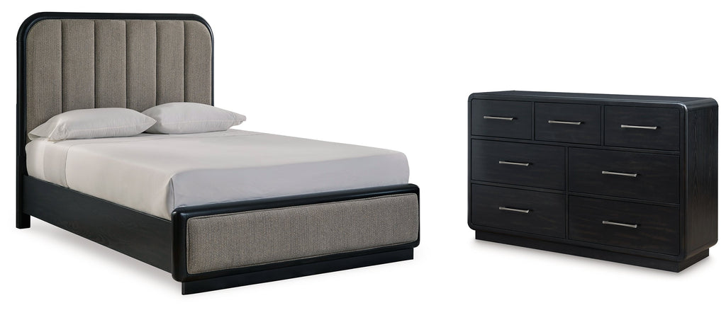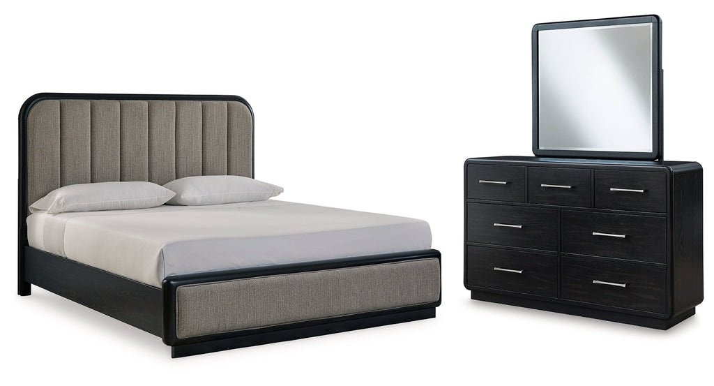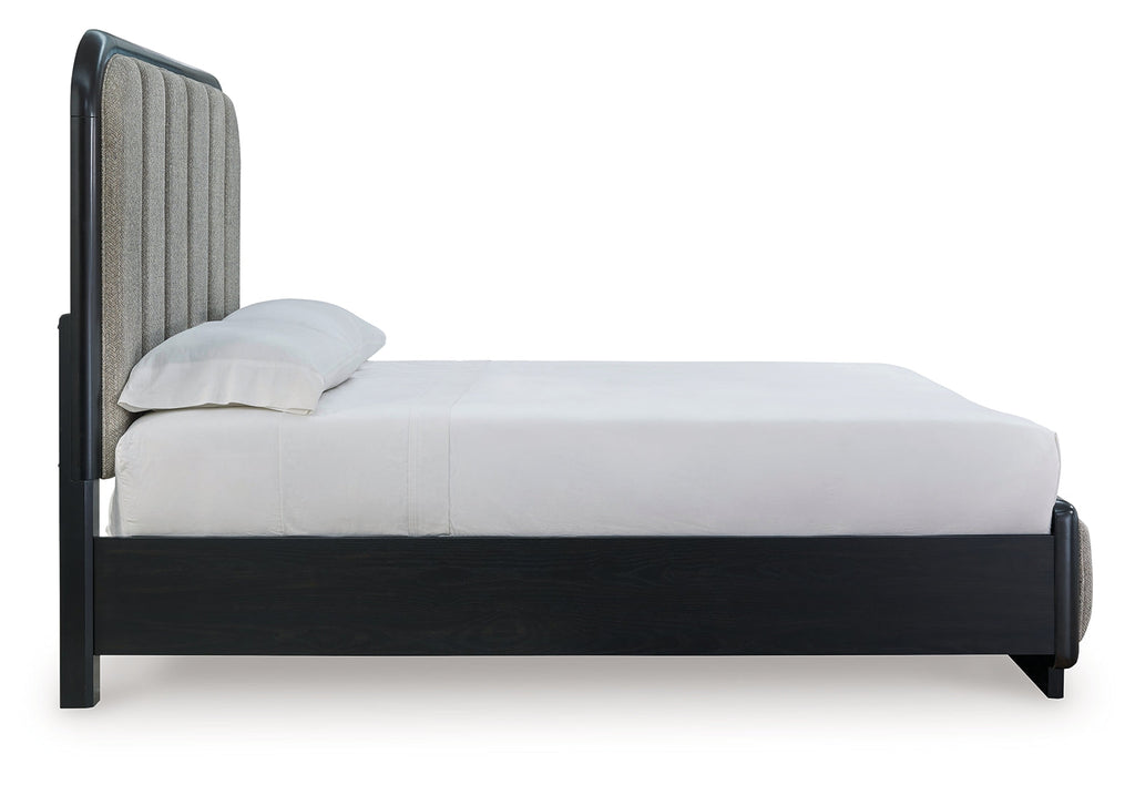 Rowanbeck California King Upholstered Panel Bed with 2 Nightstands