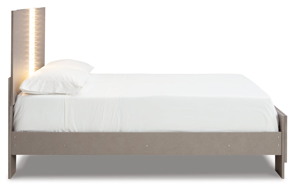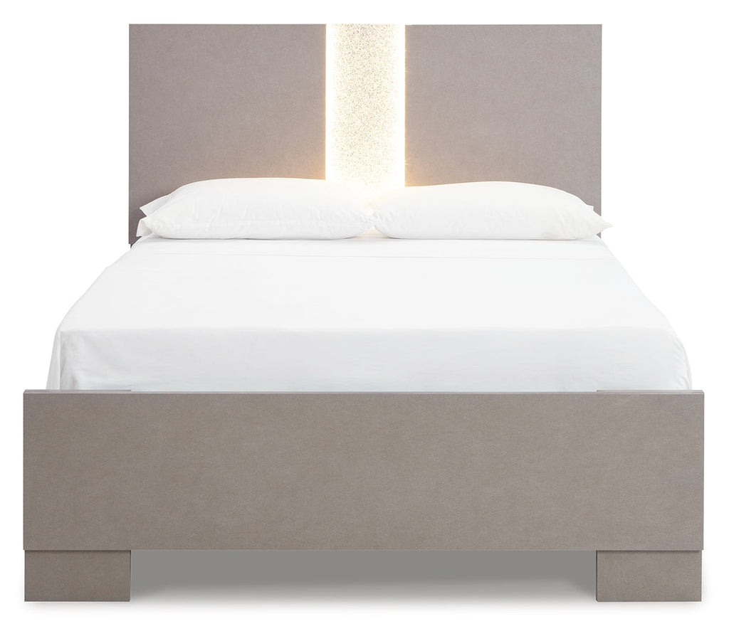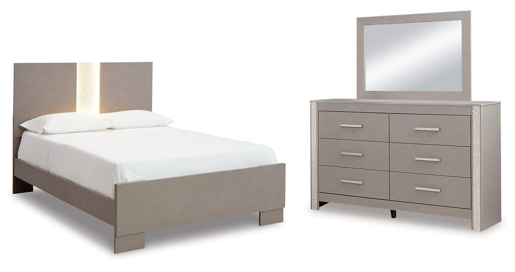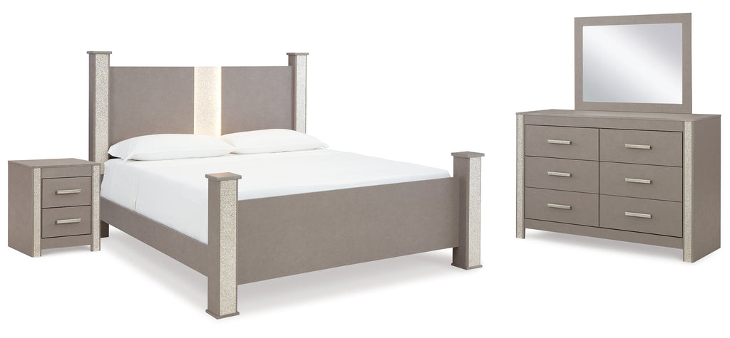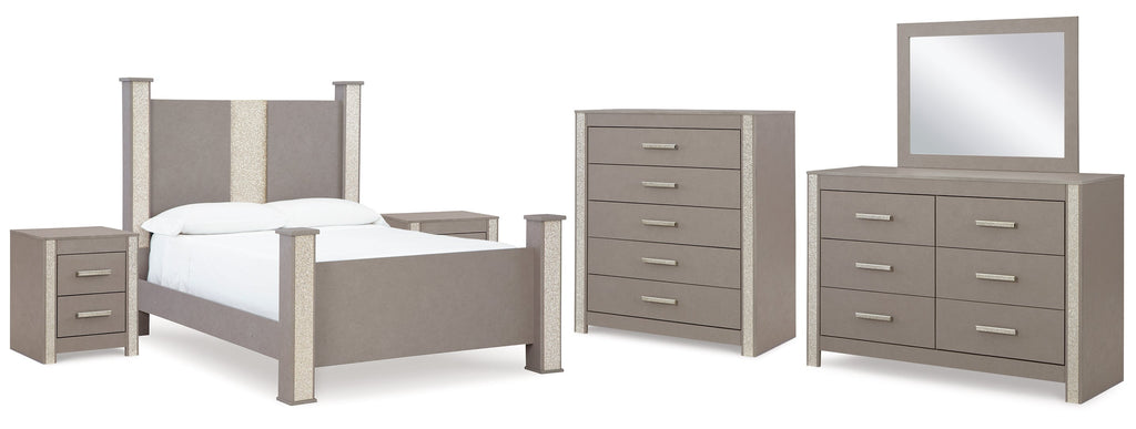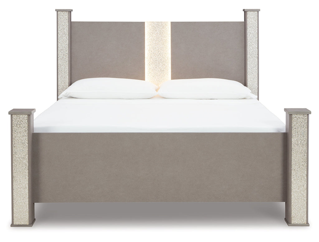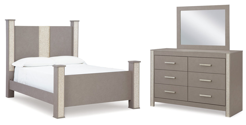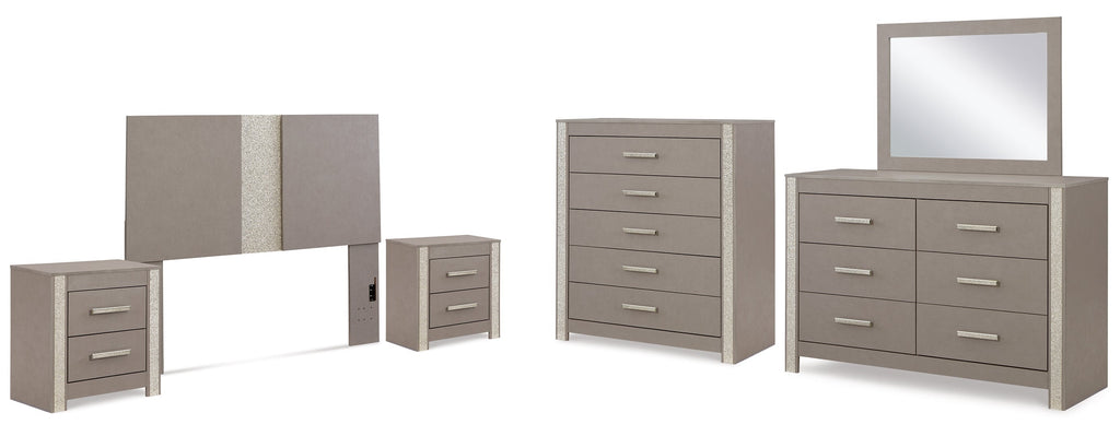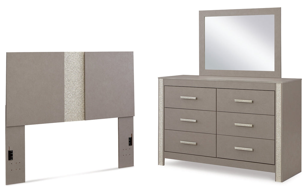 Love sleek and bold contemporary style? Drink in the beauty of this bedroom package. Its eye-catching details include glam glitter accents and the look of leather grain with a subtle gray finish. Combined with the streamlined aesthetic, this set is a simply stunning way to achieve the bedroom of your dreams.