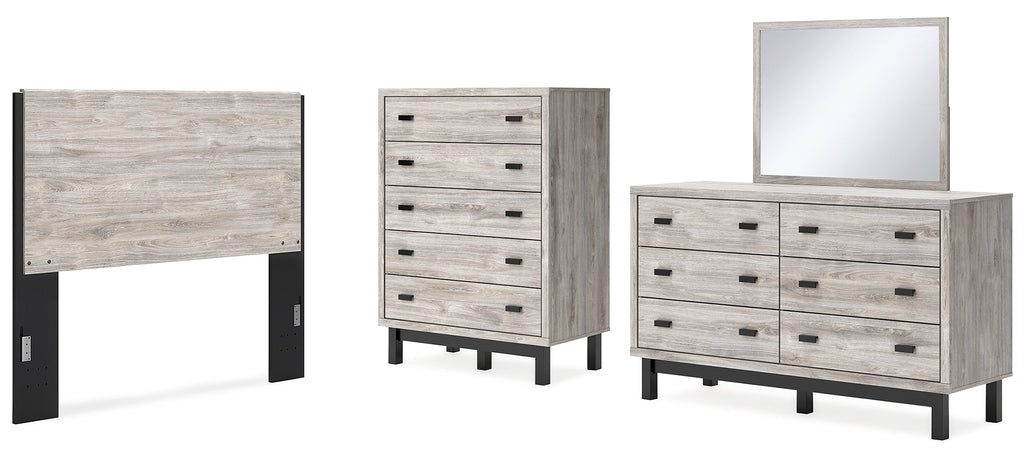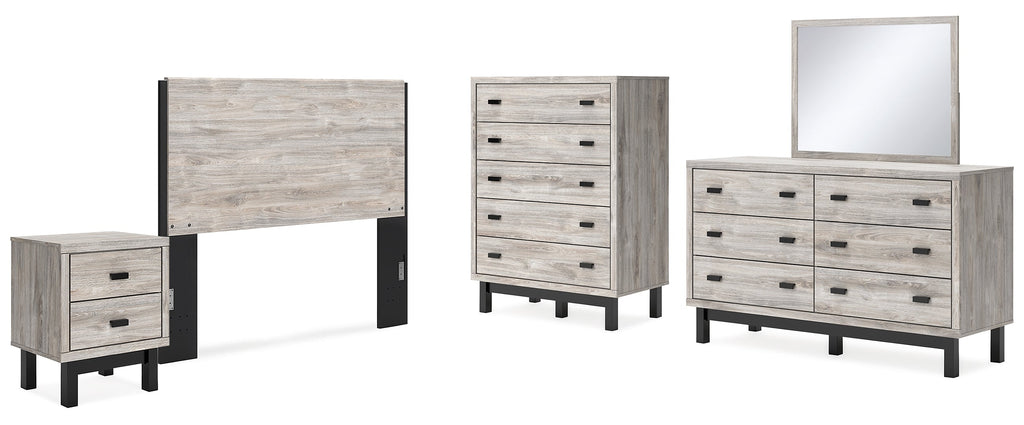 - Light gray finish over a replicated oak grain with authentic touch; footboard base has matte black finish with subtle replicated wood grain