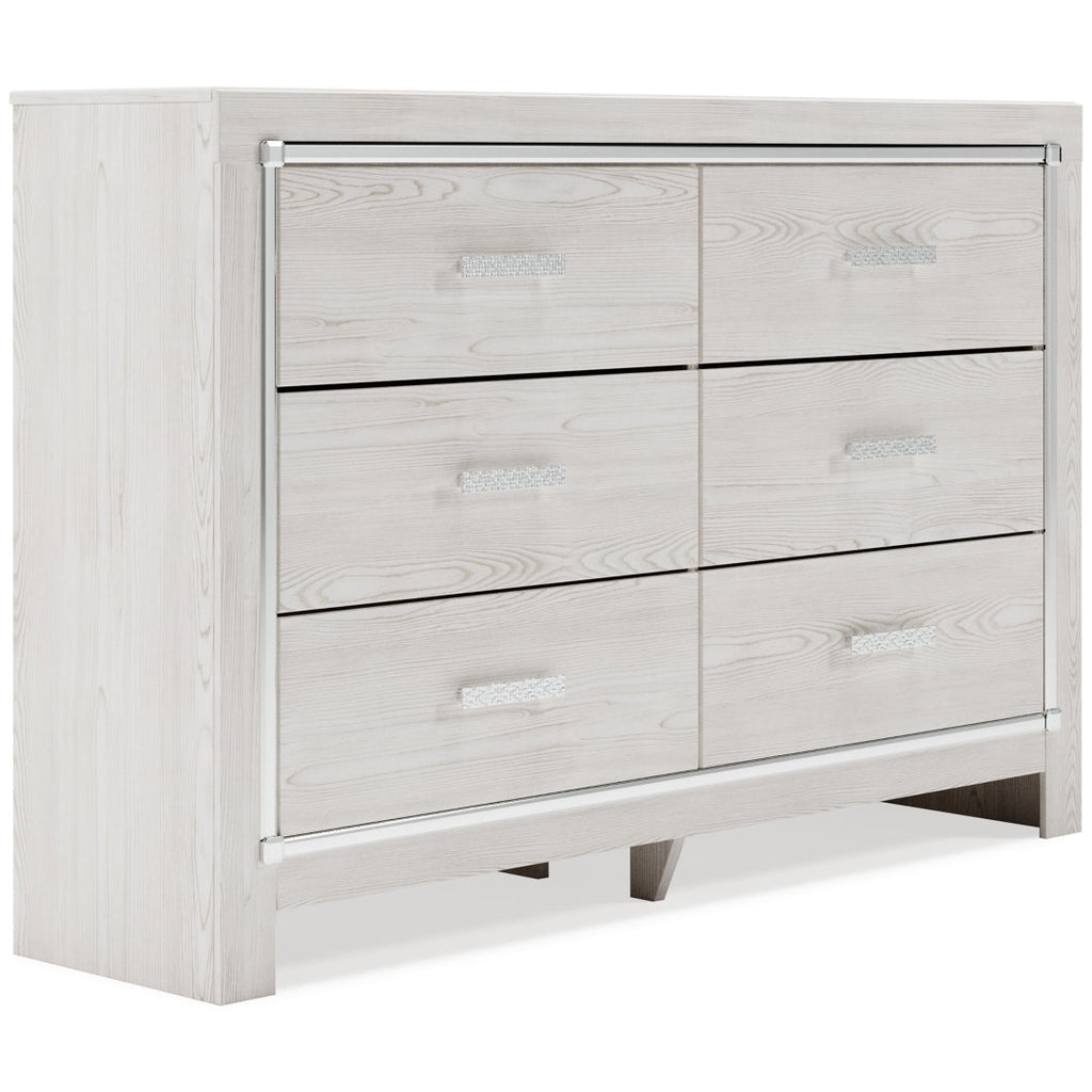 The epitome of fashion-forward design, this bedroom set is a beautiful blend of stylish comfort and luxury. Shiny chrome-tone accents, a pearlized finish and the bed’s button-tufted upholstery bring a glam touch to the richly rustic appearance. Remote-controlled LED lighting adds style and modern conveniences to your restful retreat, while smooth-gliding drawers provide plenty of storage space for your wardrobe needs.