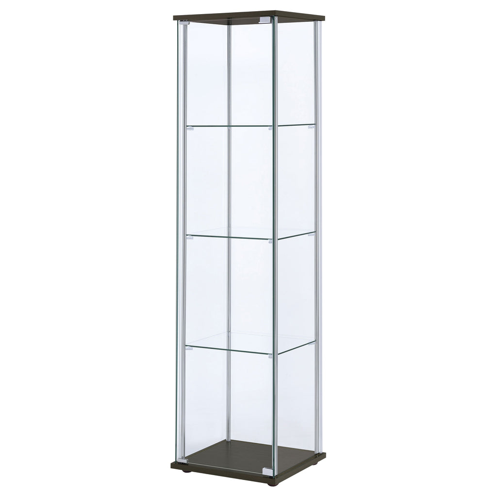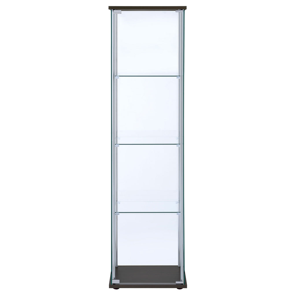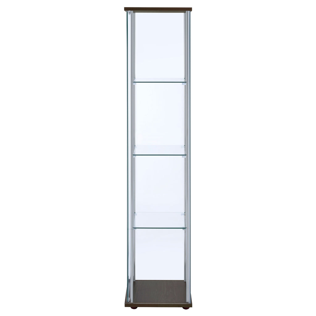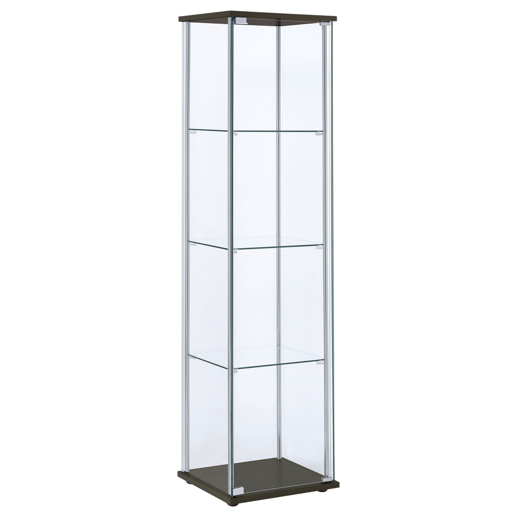 Go for a fresh new look with artistic influence. This curio cabinet turns design on its head with a new twist on tradition. Perfect for transitional spaces, its chrome support beams and cappuccino finish base and top nicely complement glass shelving and exterior panels. Three shelves clear the way for showing off your best decor. Upgrade a stylish living space with this fabulous find.