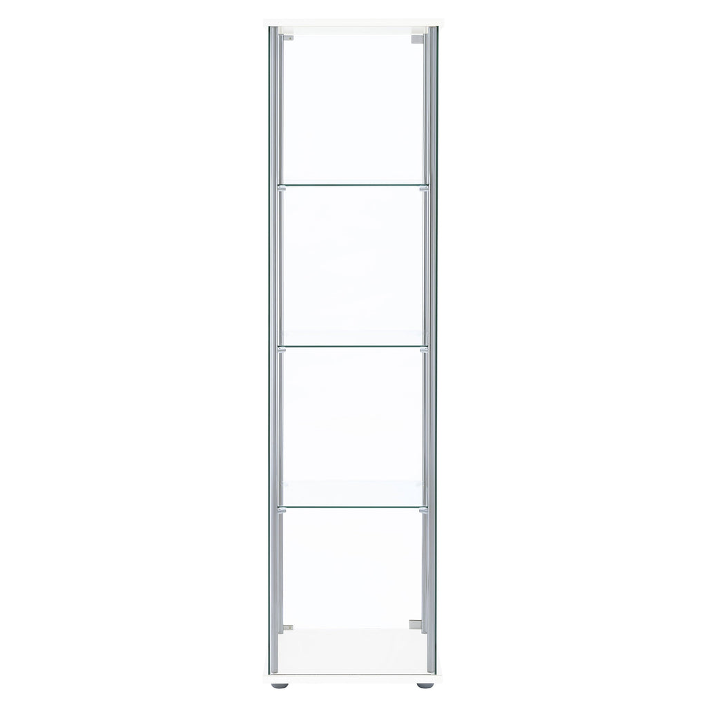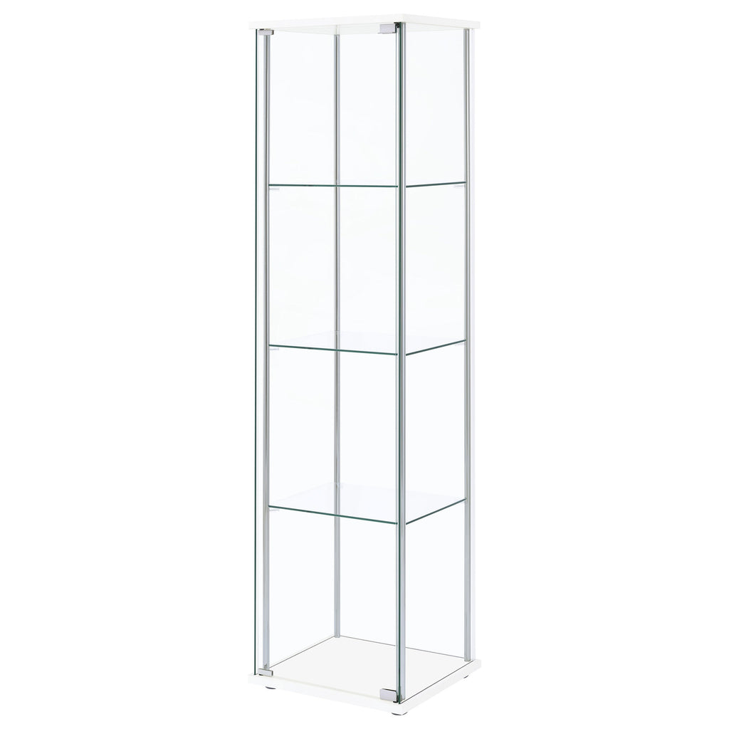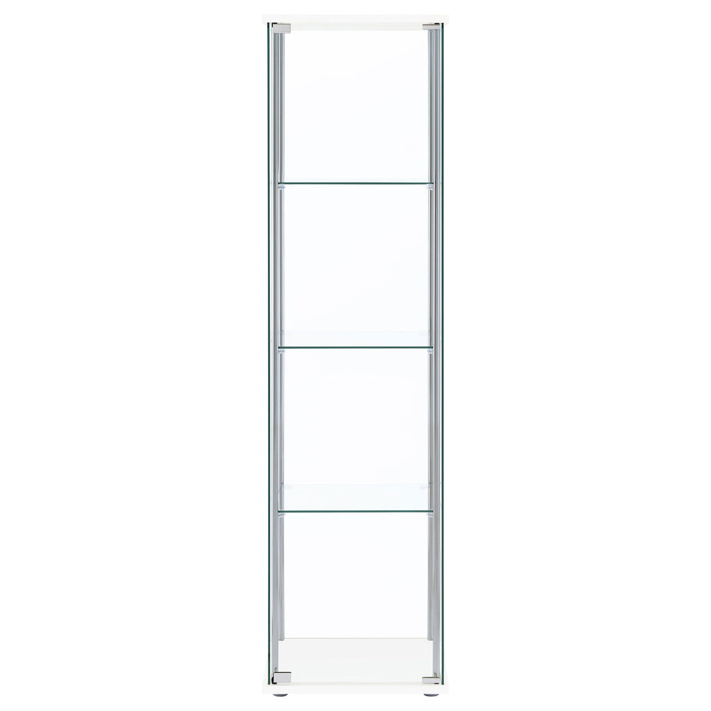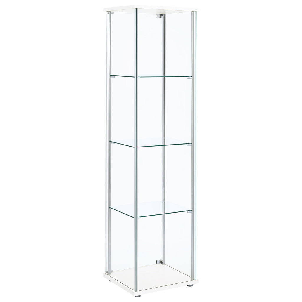 Go for a fresh new look with artistic influence. This curio cabinet turns design on its head with a new twist on tradition. Perfect for transitional spaces, its chrome support beams and cappuccino finish base and top nicely complement glass shelving and exterior panels. Three shelves clear the way for showing off your best decor. Upgrade a stylish living space with this fabulous find.