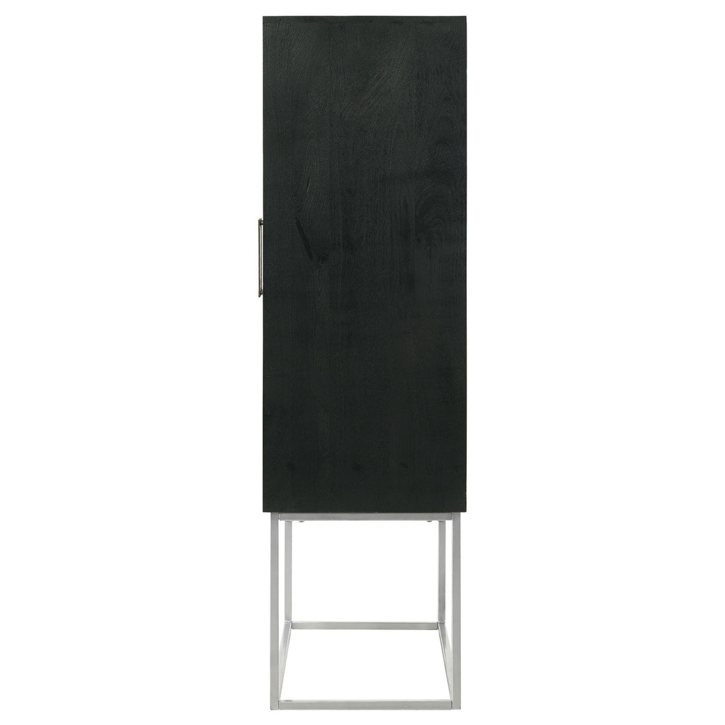 Get the party started with a sophisticated, contemporary bar cabinet. Closed, it's simply a stylish cabinet, complete with decorative checkerboard door fronts and geometric handles that catch the eye in a living or dining room. When opened, the cabinet reveal plenty of space for all your wine and cocktail needs, complete with two interior shelves to keep everything at your fingertips. The cabinet is crafted from mango wood, with a warm walnut finish on its doors and a black case finish. The cabinet is elevated on an iron base that receives a classic silver finish, delivering height and lightness to the overall look of the piece.