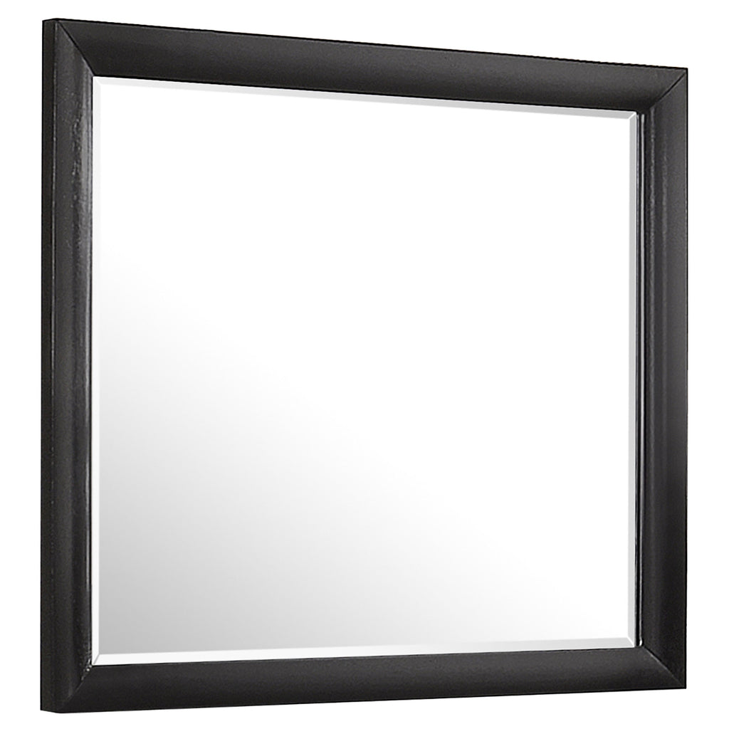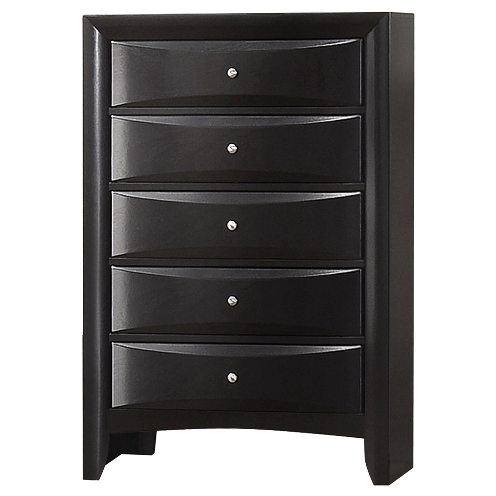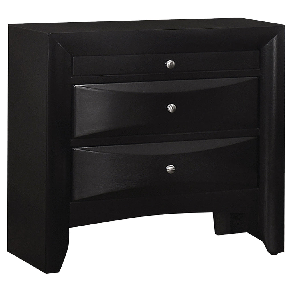 This superb 4-piece bedroom set from the Briana collection includes a nightstand and dresser. The centerpiece of the set is an impressive bed with a slightly flared leatherette-padded headboard and low-slung footboard. The clean, smooth dresser and nightstand are fashioned with beveled drawers with contrasting brushed chrome accents. A tall, rectangular mirror easily fits on top of the dresser to complete the practicality of the set. Each piece is finished in a classic, timeless black that adds an air of class to the bedroom ambiance.