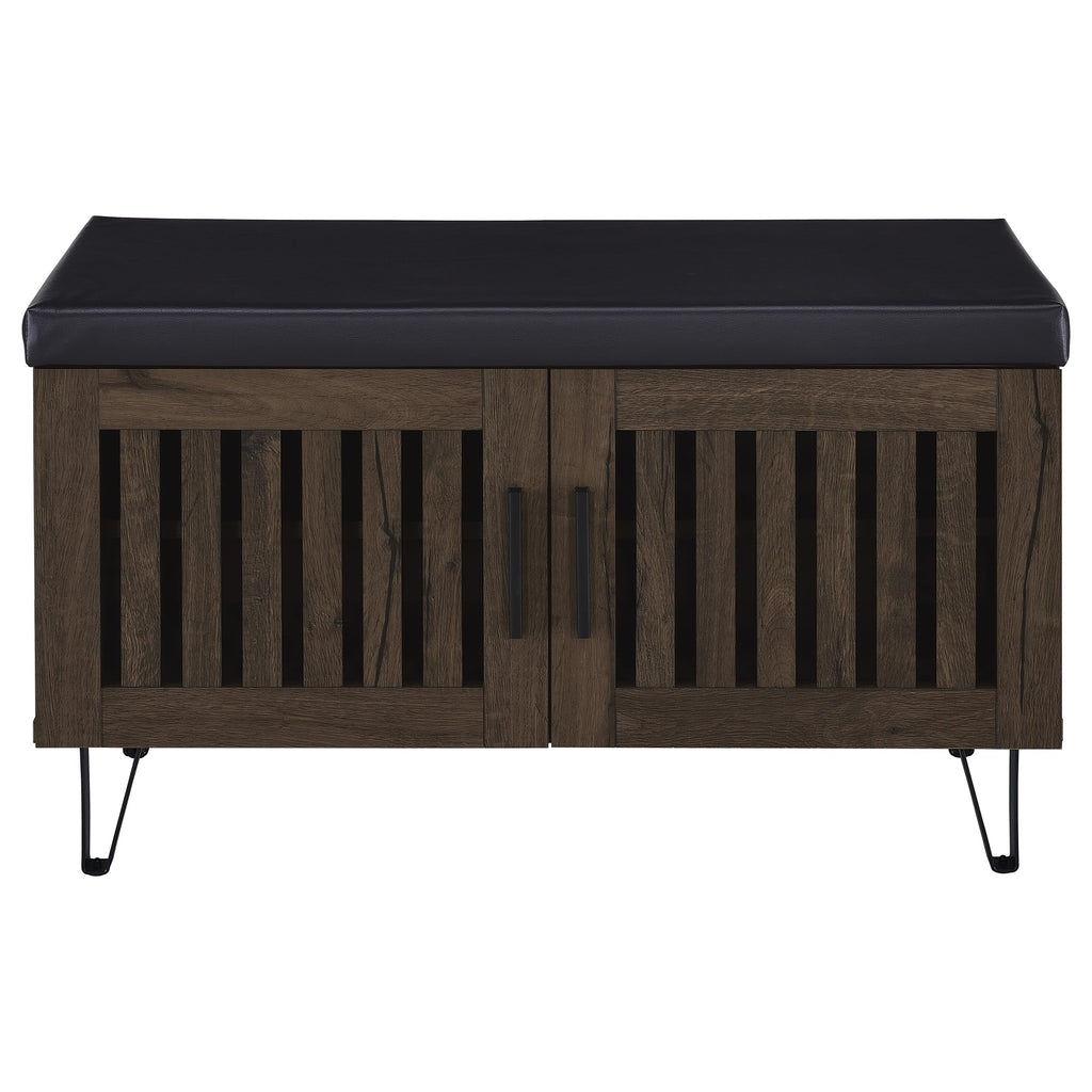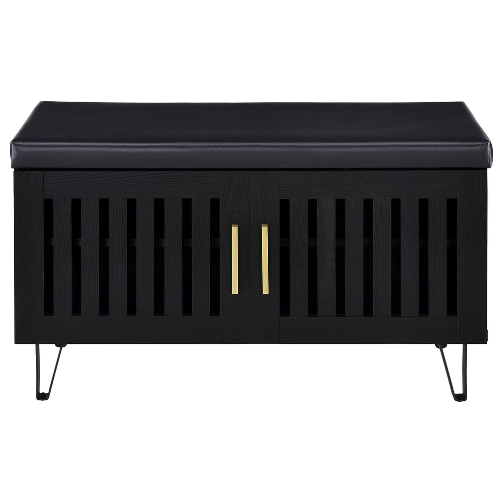 Padded top upholstered in black faux leather serves as a convenient seating bench