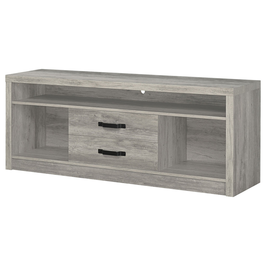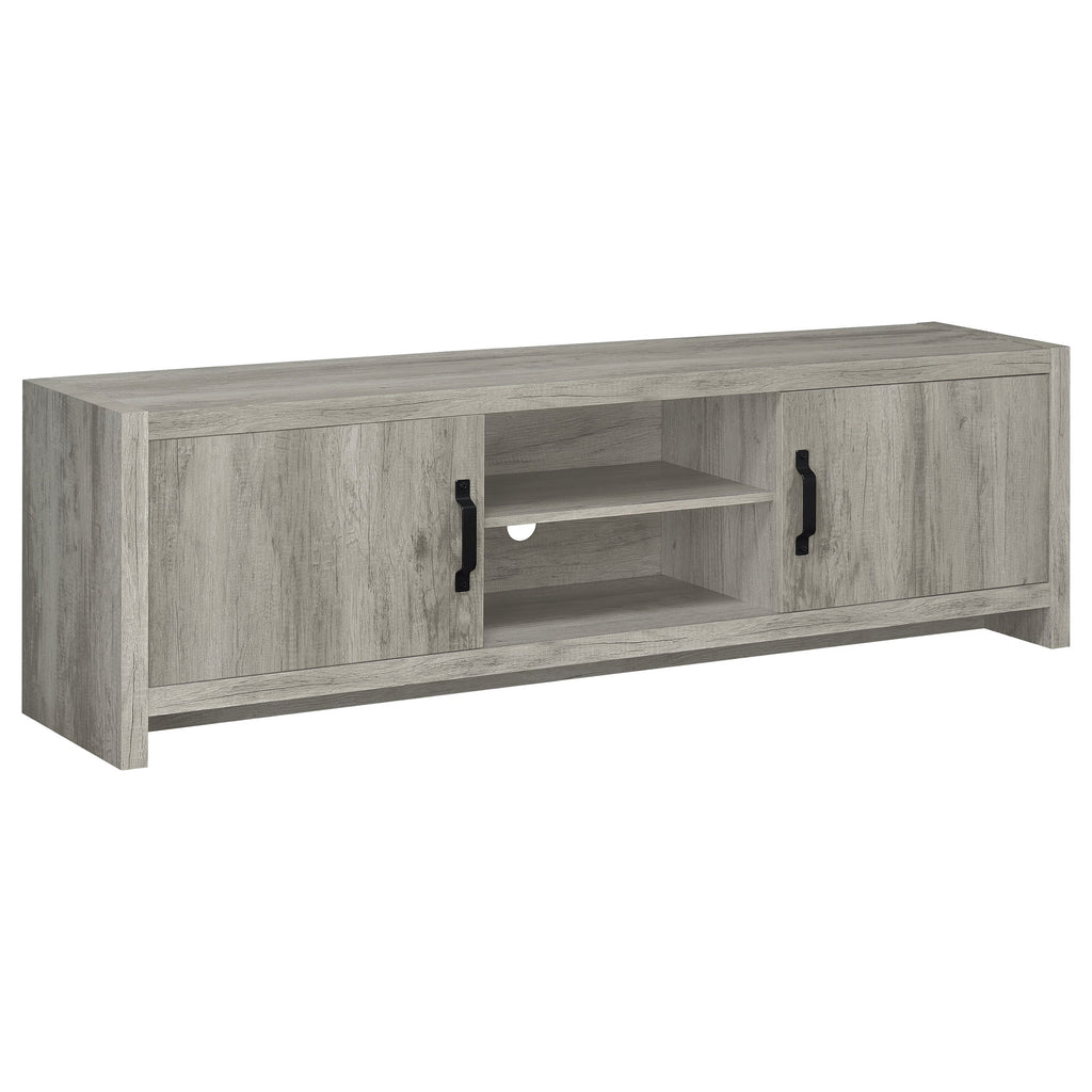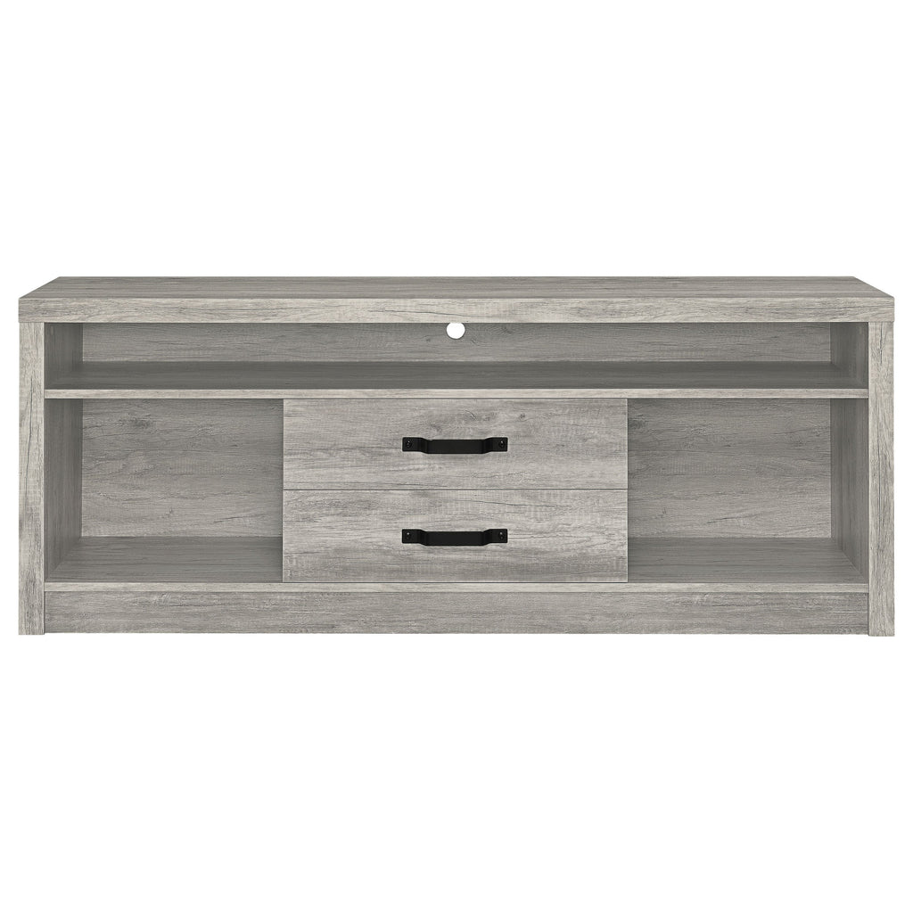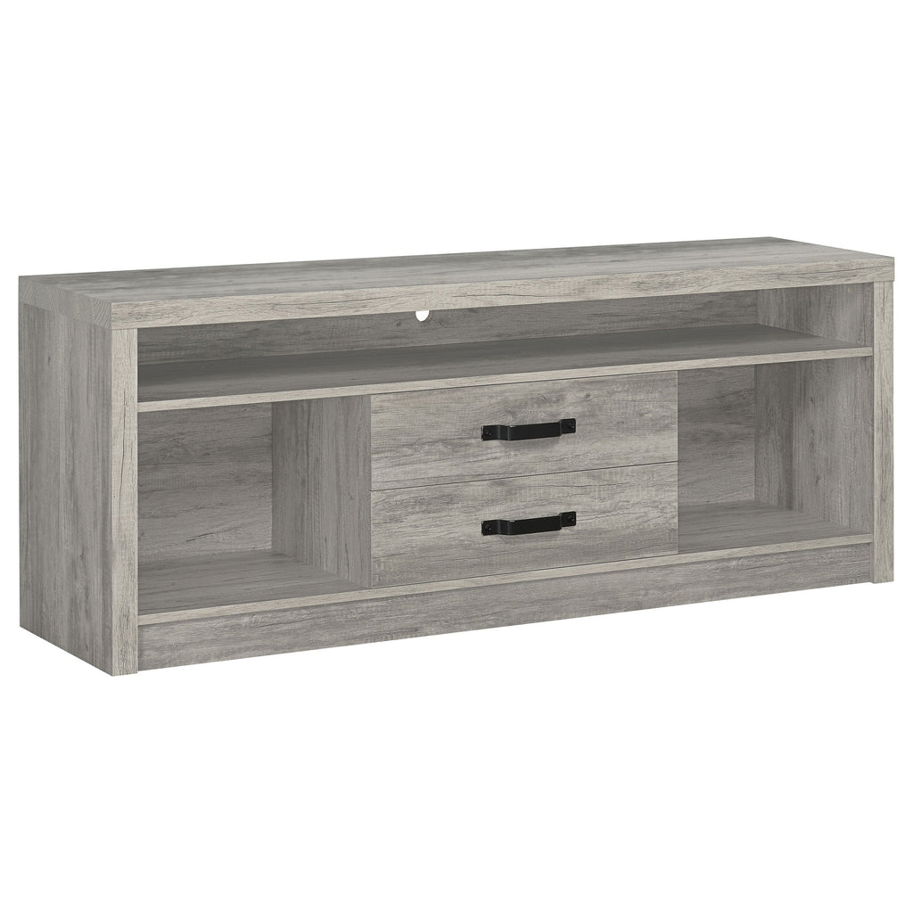 Stylize a modern space with light and airy attitude. Make this TV console a central focus in an entertaining space. A lovely grey driftwood finish reveals a natural grain effect. A spacious surface supports large-screen televisions, while a pair of open center shelves make room for components. Add more devices and media in two side cabinets.