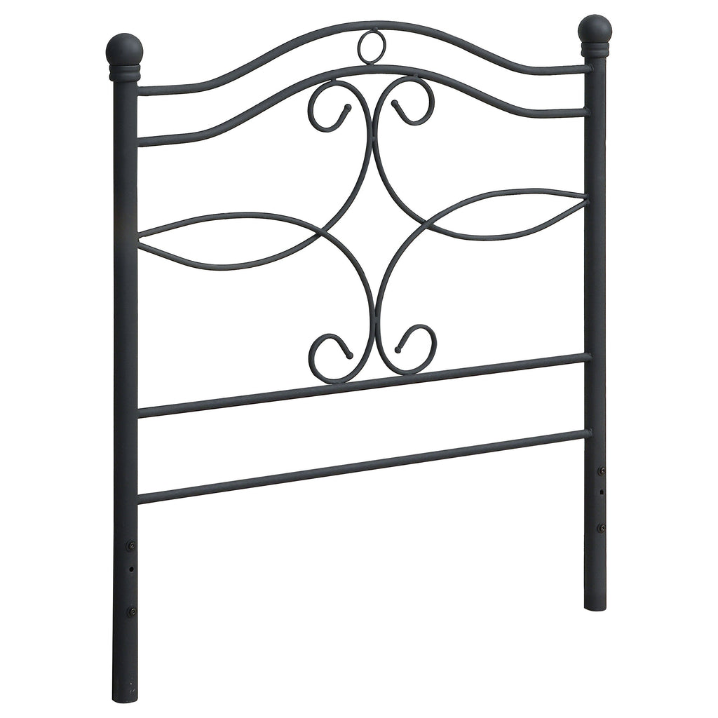 This metal twin headboard adds a sleek, unique panache to a simple metal bed frame. It features two gently arched curves at the top with metal rods underneath fashioned in ornate curves and swirls for a stylishly elaborate appearance. Both posts are topped by round knobs that are simple yet appealing. Finished in understated matte black that suits any modern decor. Also comes in full and queen sizes.