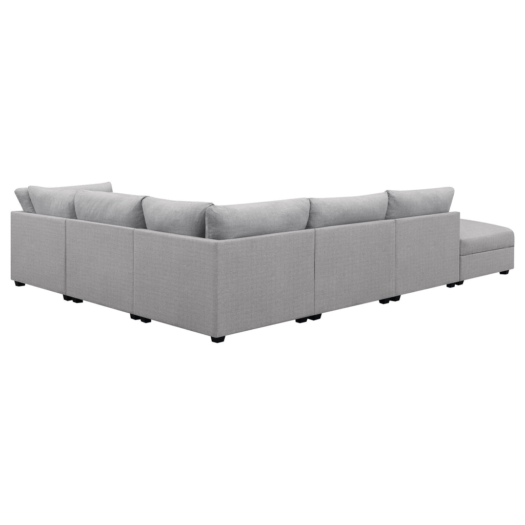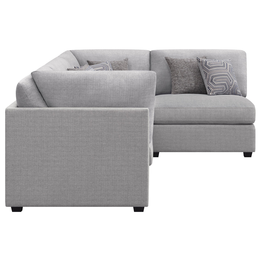 Cozy and contemporary, this modern modular sectional sofa is a stylish focal point in your inviting living room. Designed with simplicity at the forefront, it boasts smooth upholstery, straight wedge arms and plush cushions that create both a compact profile and enduring comfort. The modular set includes two corners, one armless chair and a storage ottoman, creating a chaise profile that's reversible to accommodate myriad living spaces. The ottoman top lifts to reveal interior storage that's great for everything from kid's toys to blankets. Soft gray upholstery is on-trend but neutral, and is augmented with complementary accent pillows that add softness and dimension you're going to love.