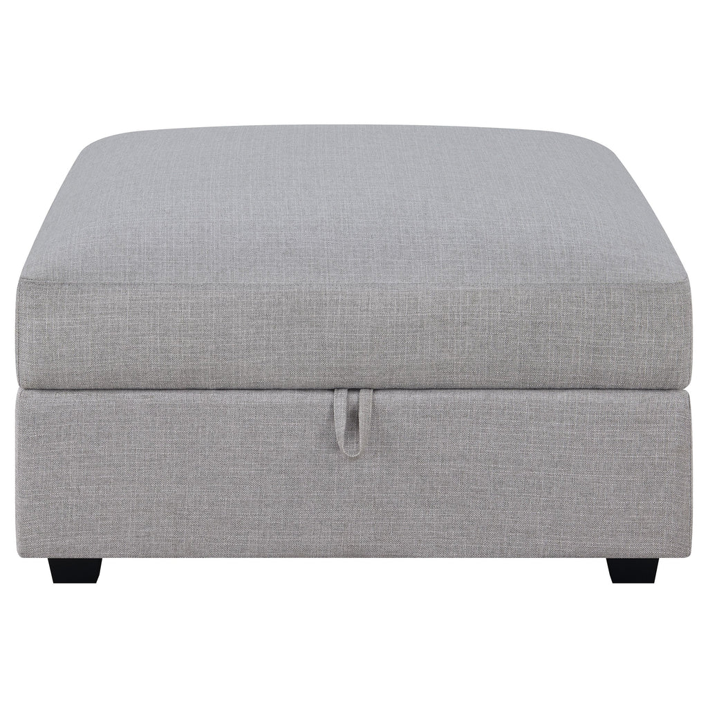 Upgrade a living room with the extra space from this grey storage ottoman. The simple silhouette showcases modern design with its clean lines. Store pillows, throws, and extra toys in the hidden compartment for a clean look. Beautiful with a variety of decor schemes, the lightly hued upholstery complements neutral and colorful motifs. Pair with the armless chairs from the modular sectional to create a chair, or place in the center for a plush footrest or extra seating.