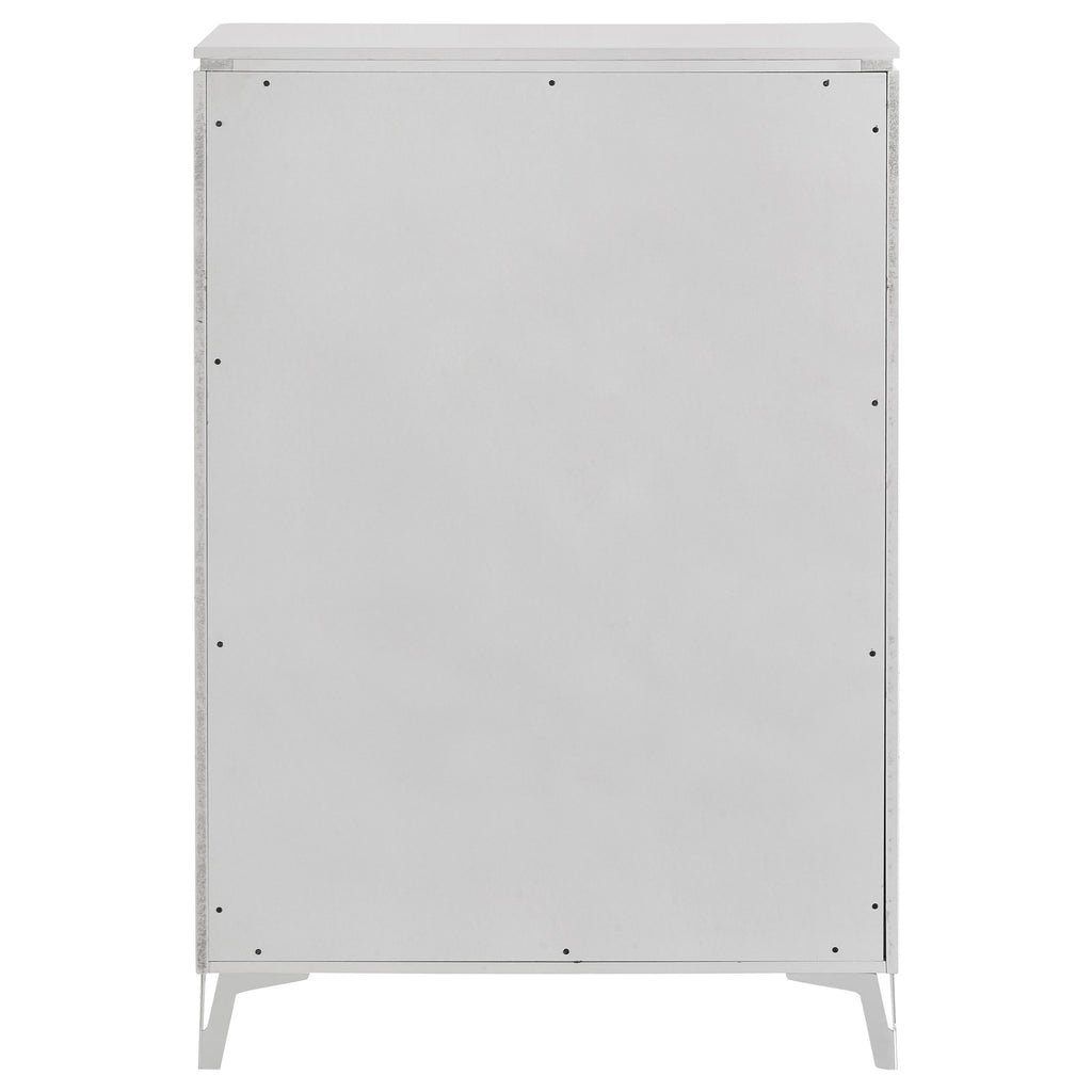 With a sleek high gloss finish and sculptural texture, this five-drawer chest makes a striking addition to the modern bedroom. Its geometric drawer fronts feature ribbed V-patterns that shift across each tier, accented by polished chrome U-shaped pulls. The top drawer is lined in black felt for delicate storage, while all drawers operate smoothly on 45mm ball bearing glides. Elevated on tapered chrome-finished legs, this chest offers elevated storage with sharp visual impact.