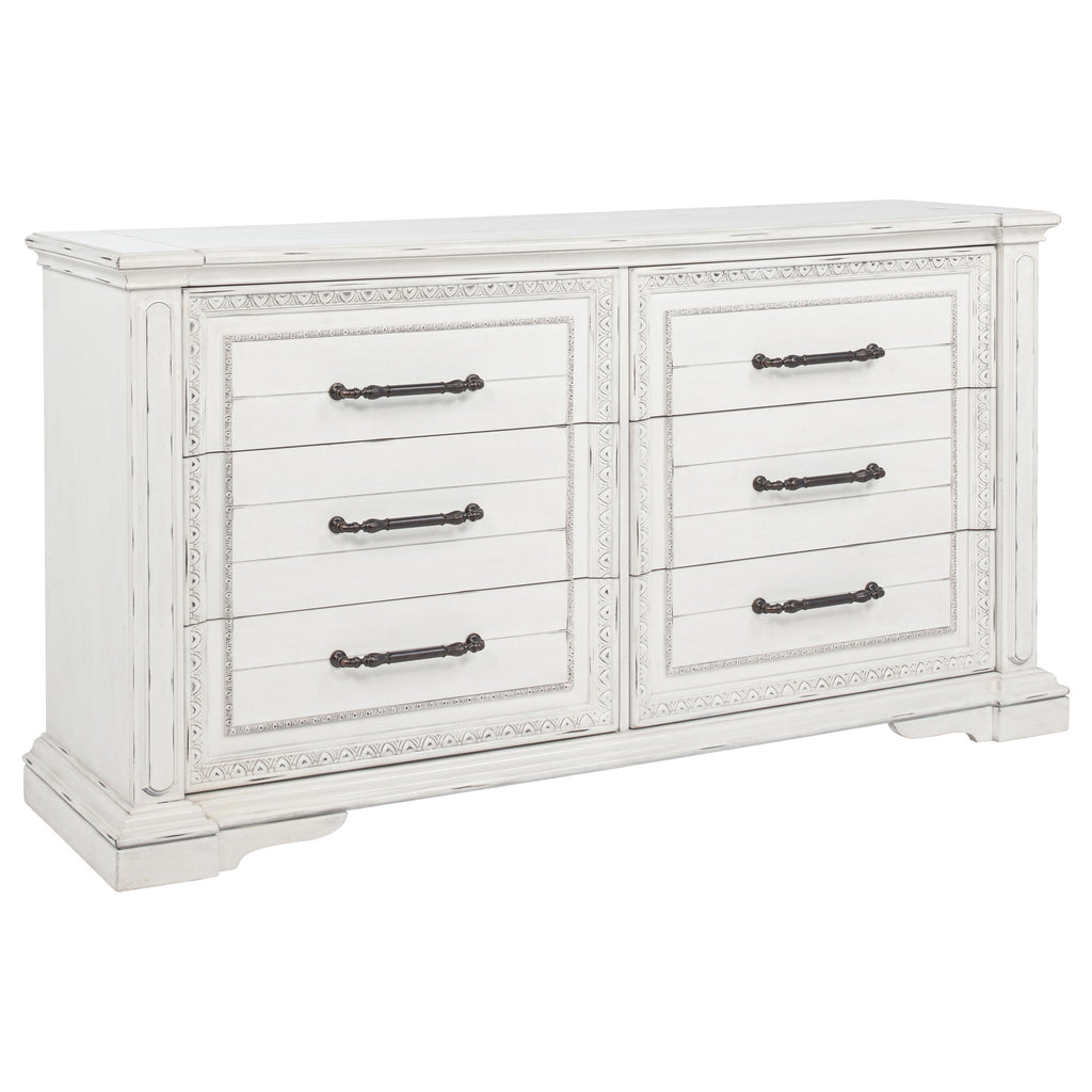 Classic and composed, this six-drawer dresser blends traditional design with elegant practicality. Its vintage white finish is gently distressed, accentuating ornate trim and antique bronze drawer pulls. A hidden jewelry tray tucked into the bottom drawer adds a thoughtful touch, while spacious drawers offer smooth functionality. Crafted from poplar and engineered wood, it brings heritage-inspired charm to any bedroom.