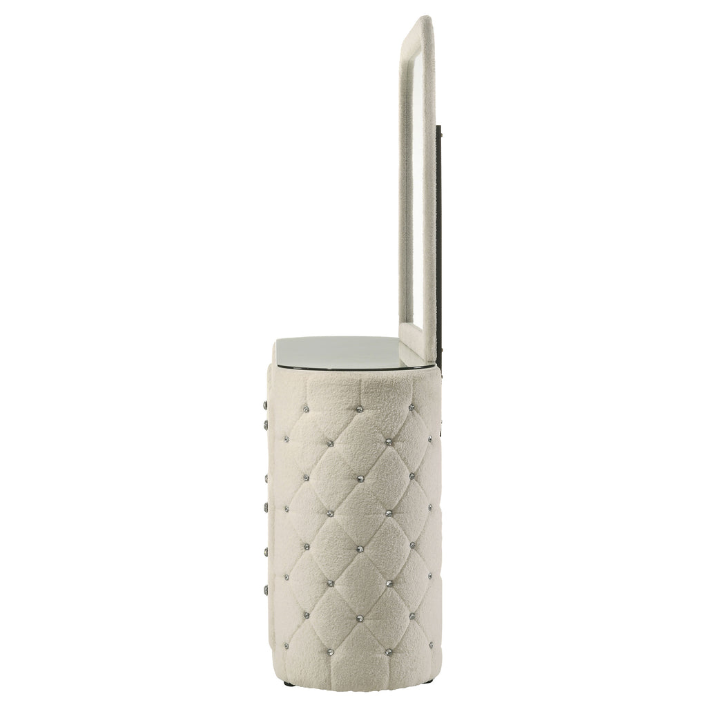 Wrapped in a cloud of boucle and gleaming detail, this dresser and mirror set transforms any bedroom into a personal sanctuary. Diamond tufting along the sides sparkles with embedded crystal accents, while vertical channeling on each drawer adds tailored rhythm and depth. Topped with a sleek mirror framed in matching fabric, the design offers a romantic balance of softness and structure, inviting both elegance and indulgence into everyday routines.