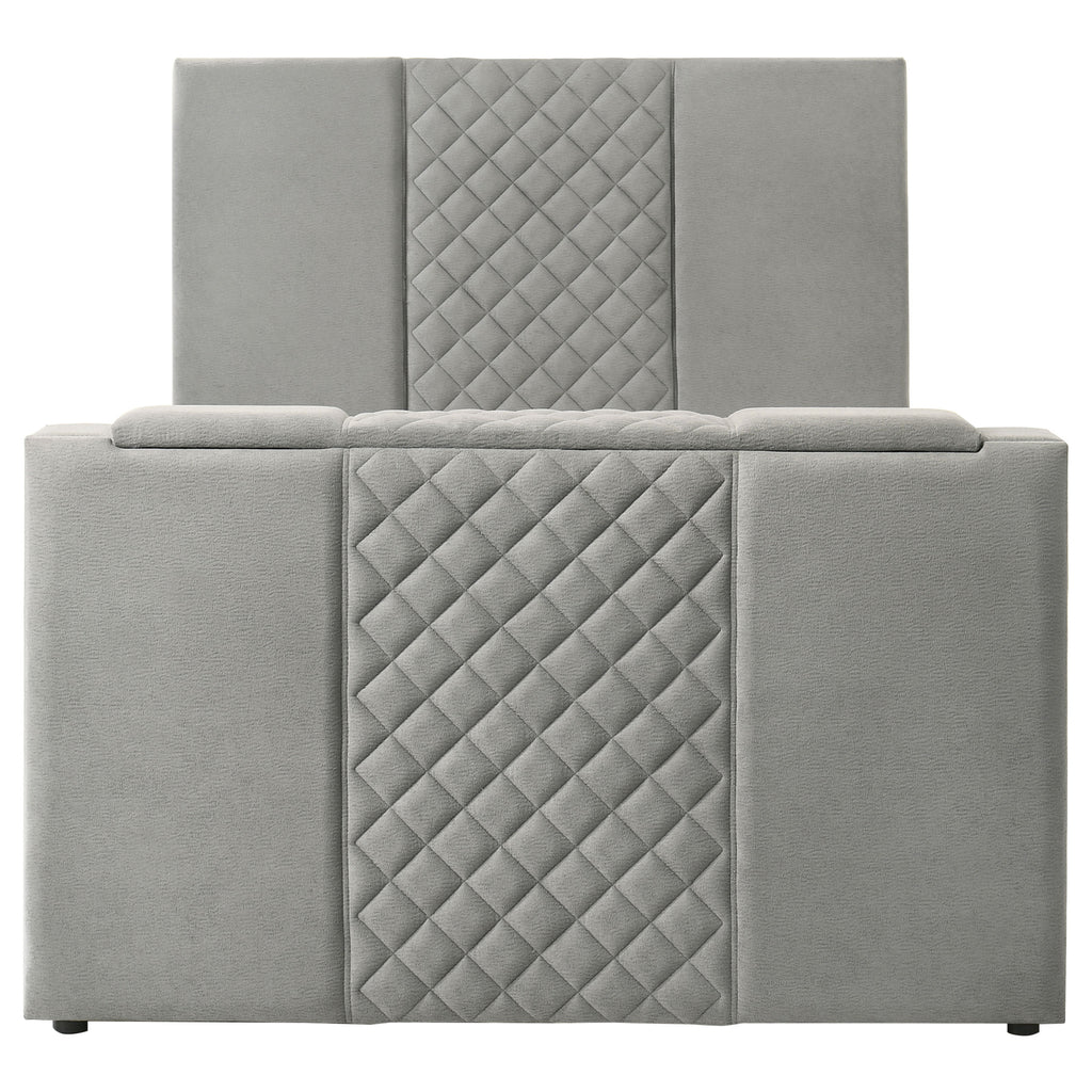 This bed is where elegance meets indulgence, inviting you to unwind in a world of luxury and innovation. A quilted velvet headboard adds a soft, sculptural presence, while the footboard conceals a motorized TV lift that glides open with a wireless remote. Designed to cradle screens up to fifty inches, it includes a discreet power outlet for seamless connectivity. Wrapped in plush velvet and framed in foam-padded wood, this bed redefines rest with a whisper of modern romance.