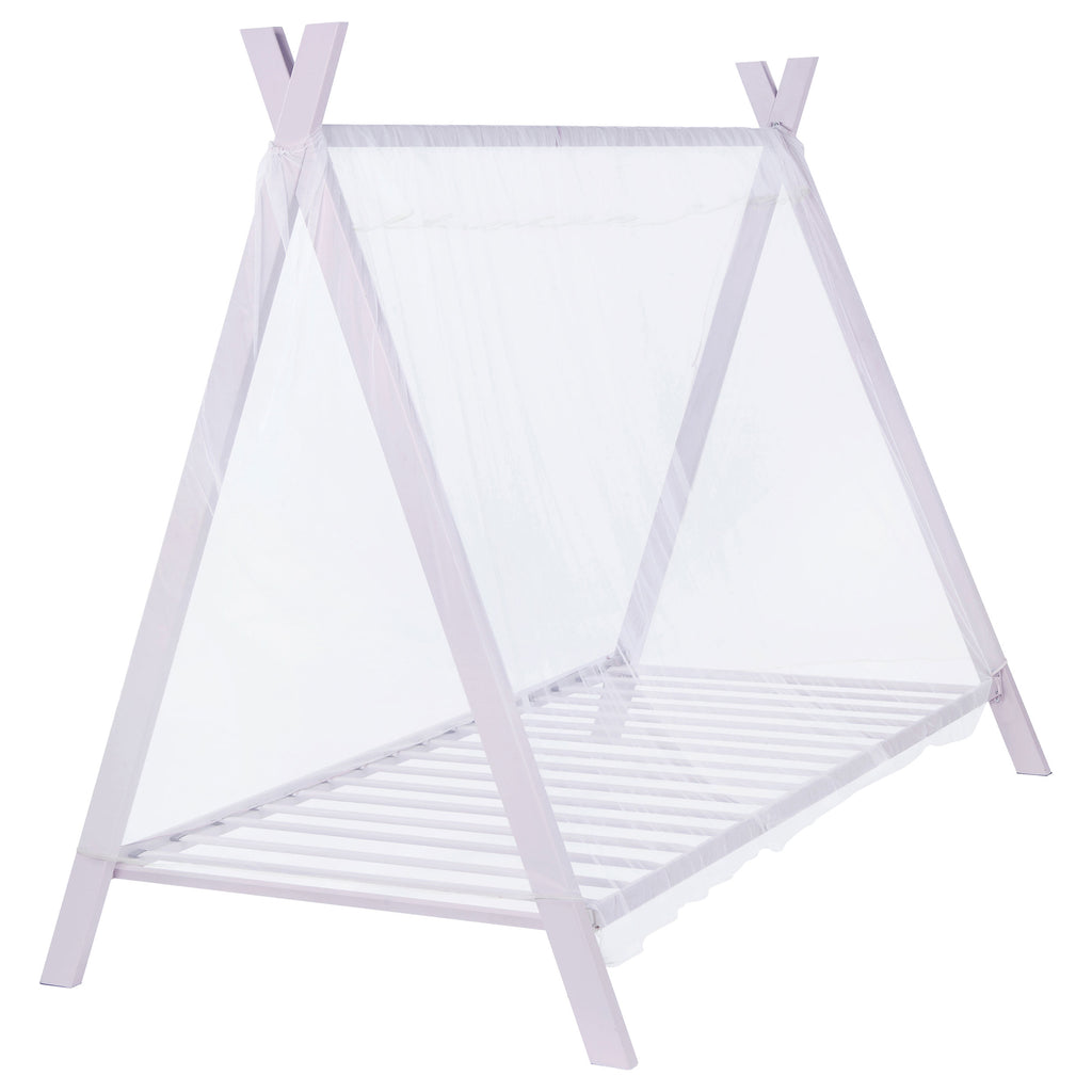 This twin-size tent bed brings a playful touch to any bedroom while offering practical comfort. Crafted from heavy-gauge metal with a powder-coated pink finish, the frame features a charming tent-style design. The included sheer fabric canopy drapes over the structure, creating a cozy retreat. Its platform base supports a mattress without the need for a box spring, ensuring a low-profile look while maintaining sturdy support.