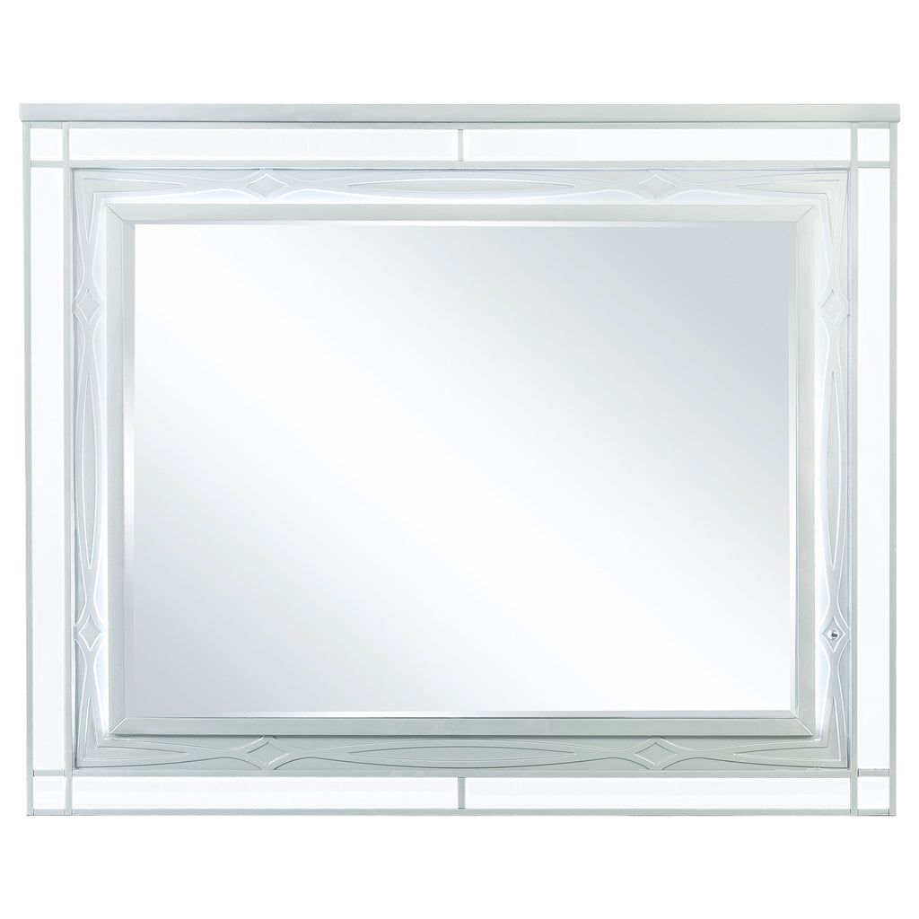 Rectangular dresser mirror framed in silver metallic and mirrored trim