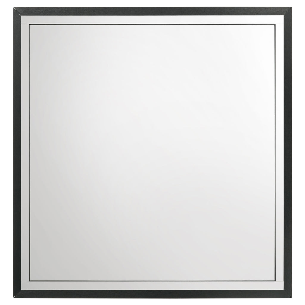 Put a glamorous finishing touch on your dresser with a modern framed mirror. Offering a polished touch of style, the mirror boasts a sleek, squared silhouette complete with a bold black finish. Gleaming chrome finish trim augments the front of the frame, creating a hint of coolness in an elegant bedroom. The mirror glass is flat, offering modern style and ambiance. It's the perfect accessory for a dressing area, creating a great place for touching up your hair or choosing jewelry for the day ahead.