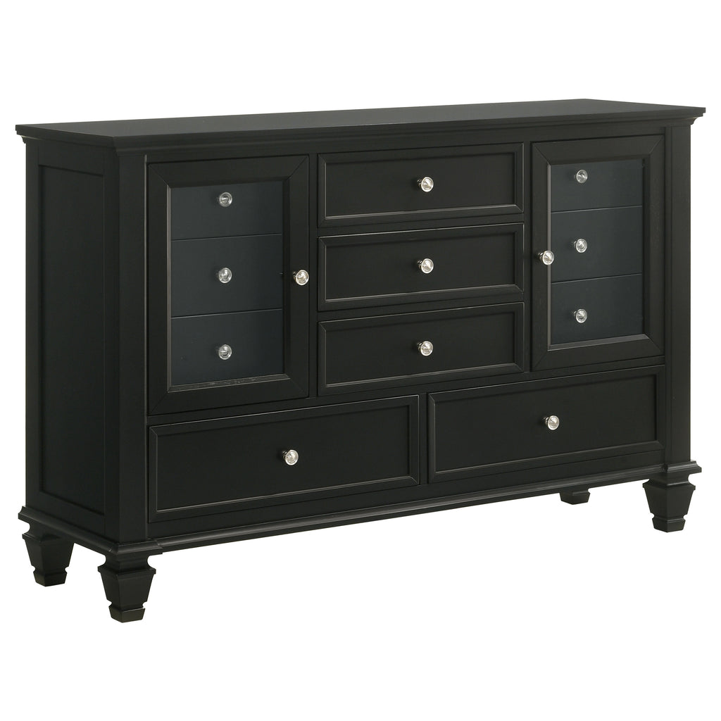 Features a variety of storage solutions, including spacious drawers and glass-paneled cabinets