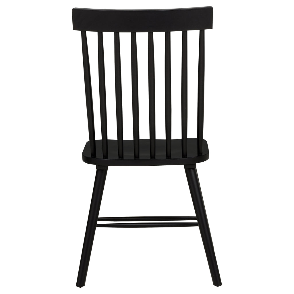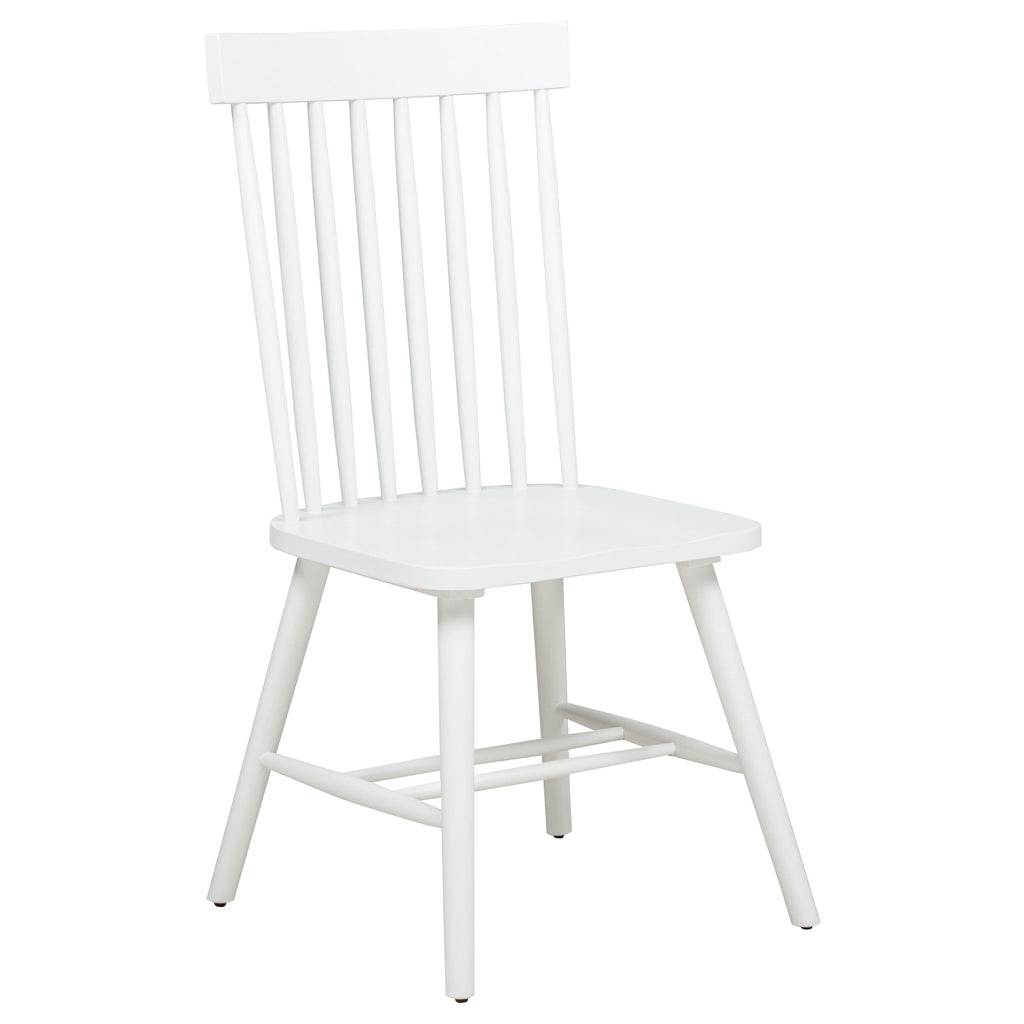 Classic and casual with a fresh farmhouse flair, this Windsor-style side chair features a high spindle back and gently contoured seat for timeless comfort. The clean silhouette is crafted from solid rubberwood with a rich wood veneer that enhances its natural grain. Angled legs with double stretchers offer reliable support and charm. Ideal for everyday dining, breakfast nooks, or cozy kitchen spaces.