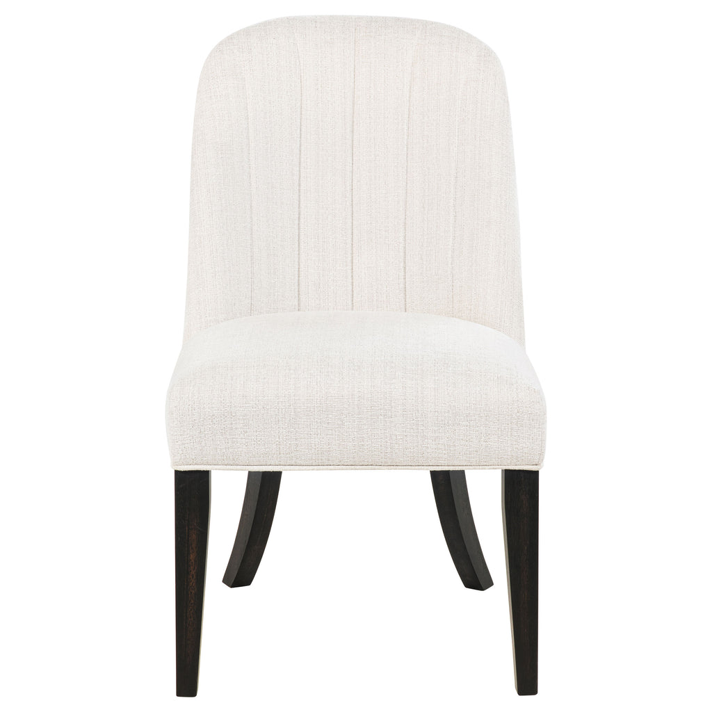 Dining side chair wrapped in cream fabric with subtle channel tufting along the back
