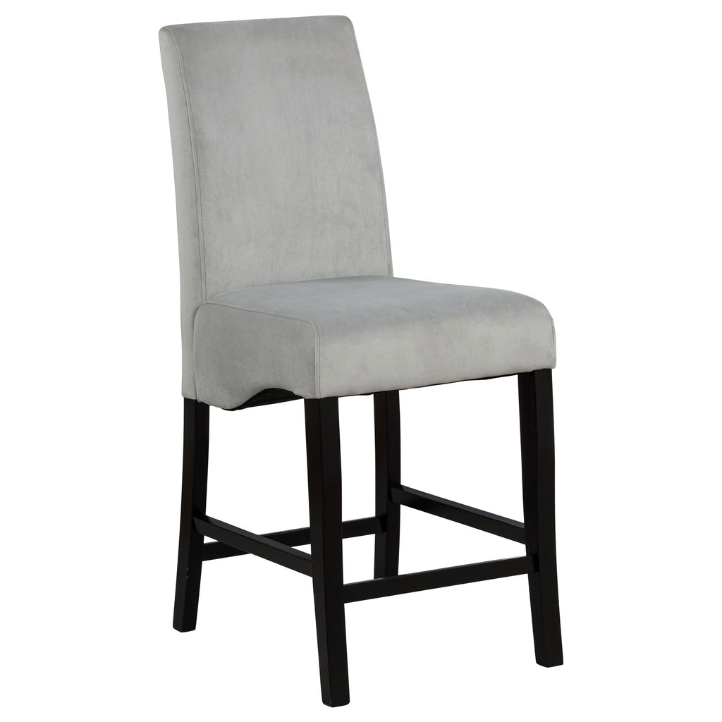 Upgrade your dining space with these elegant counter-height dining chairs. Designed with a classic Parsons silhouette, these chairs feature plush grey velvet upholstery for a soft, luxurious feel. The solid rubberwood frame, finished in deep black, offers durability and a striking contrast. A gently curved seat provides lasting comfort, while a built-in footrest ensures support. Perfectly complementing modern or transitional settings, these chairs add sophistication to any counter-height dining table.