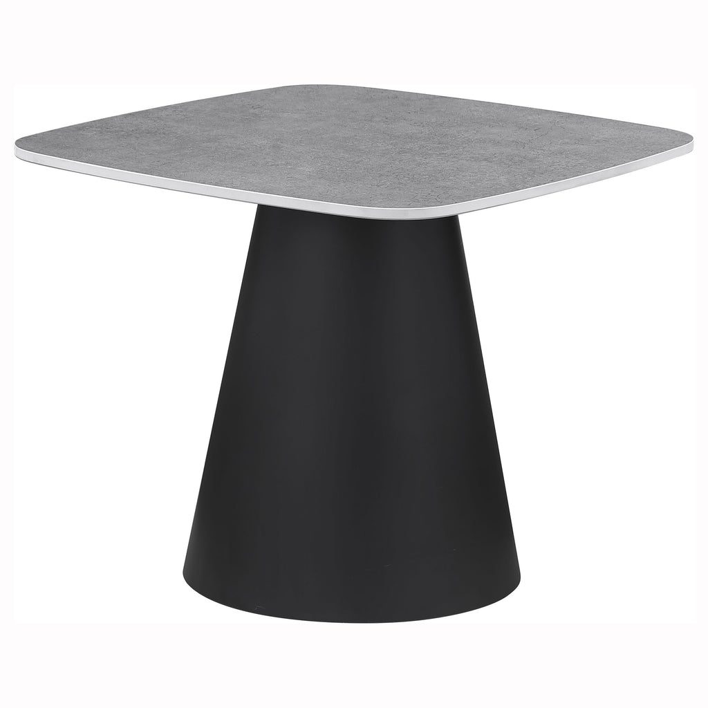 This two-piece coffee table set captures modern artistry through sculptural form and mixed materials. Each table features a square top with softly rounded corners in a concrete-look finish, perfectly balanced on matte black conical bases. The nesting design allows for flexible arrangement and compact storage. Constructed from durable engineered wood and sturdy metal, this cocktail table set makes a bold impression in any contemporary living space.