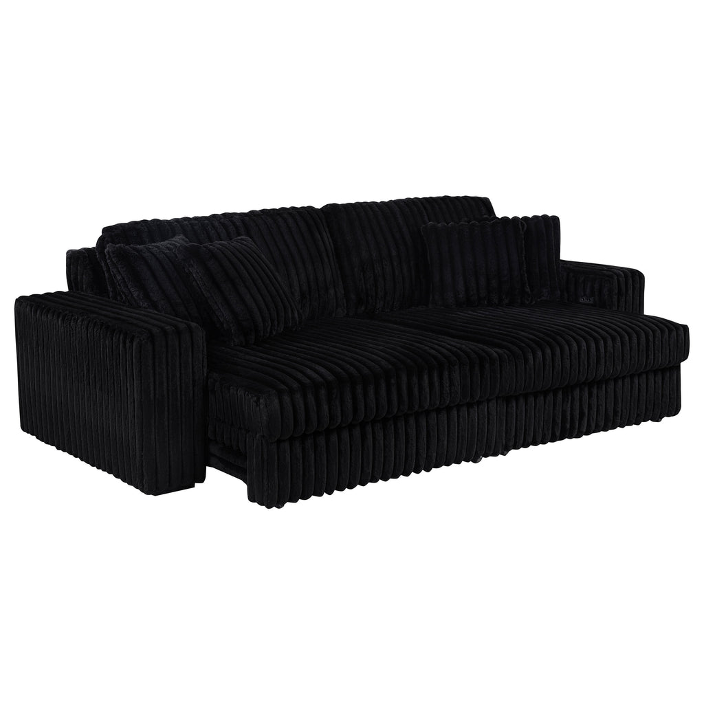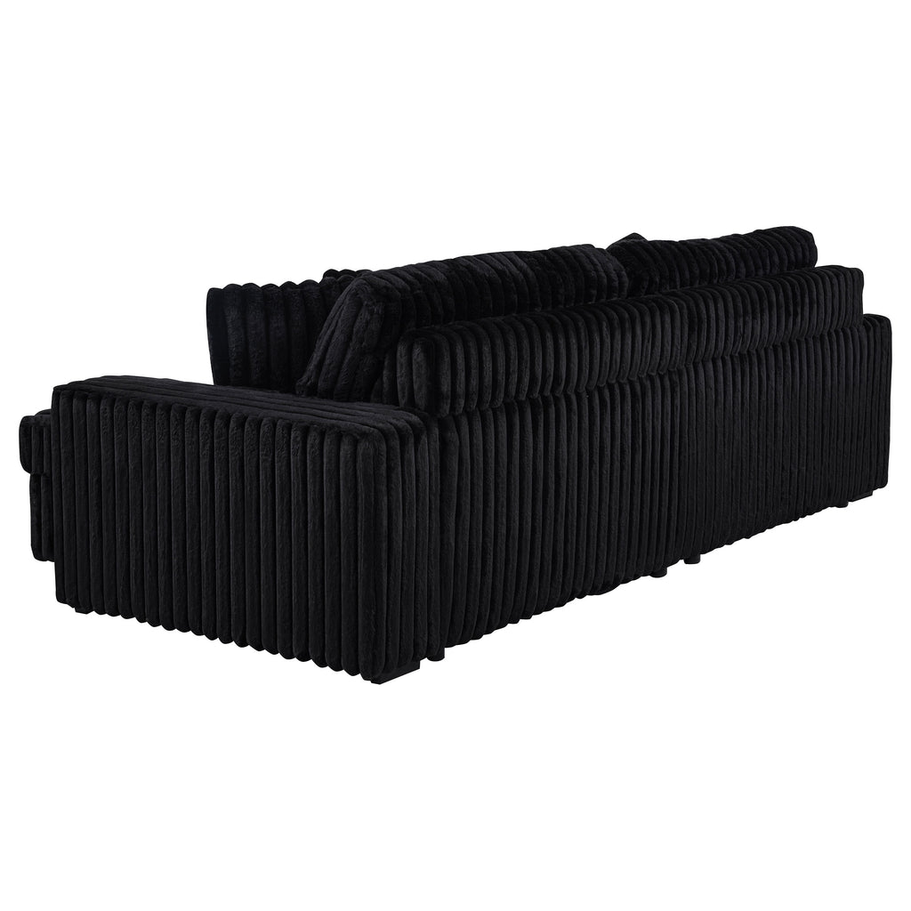 Contemporary sofa set in black corduroy features deep channel tufting and dual power chaise design