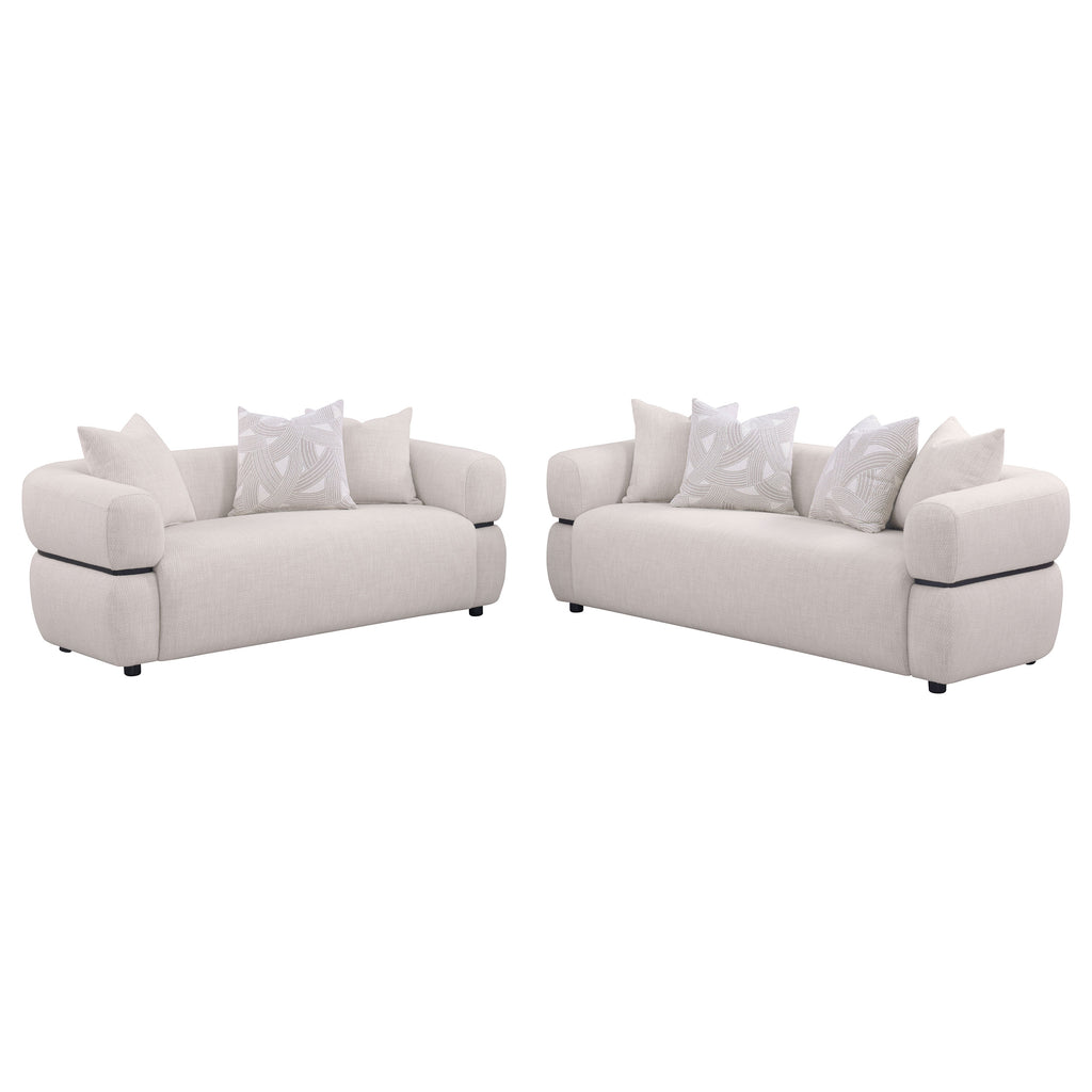 Sculptural sofa set in beige upholstery features waterfall bench seats and plush feather-blend pillows