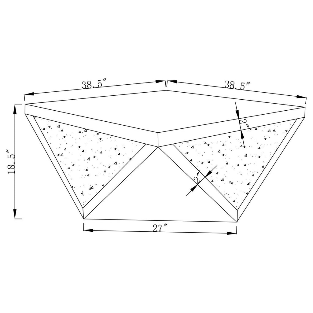 This mirrored coffee table set exudes modern luxury with bold, diamond-shaped designs. Including a coffee table and end table, both pieces feature triangular mirrored surfaces and glittery material for a glamorous touch. The square, reflective tops enhance their elegance, while the striking geometric bases make them perfect for adding a statement of opulence to contemporary interiors.