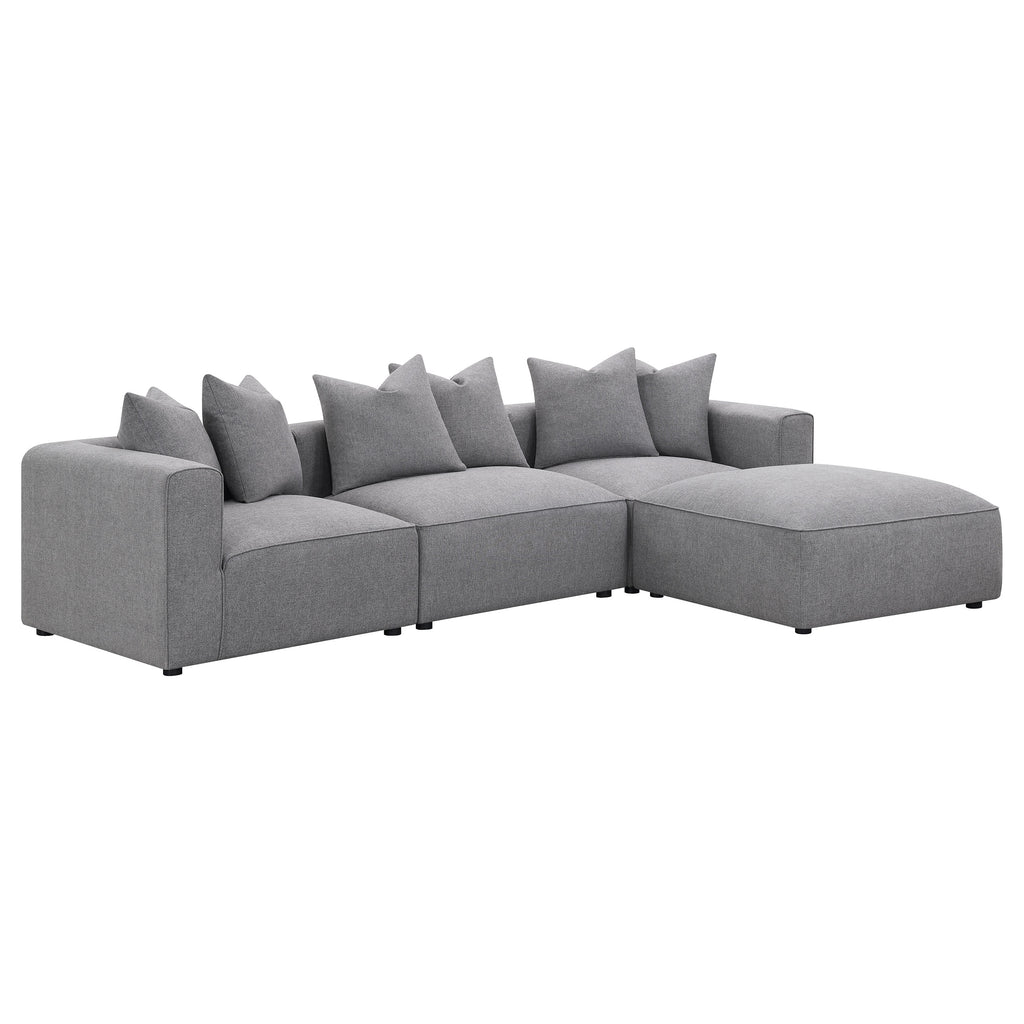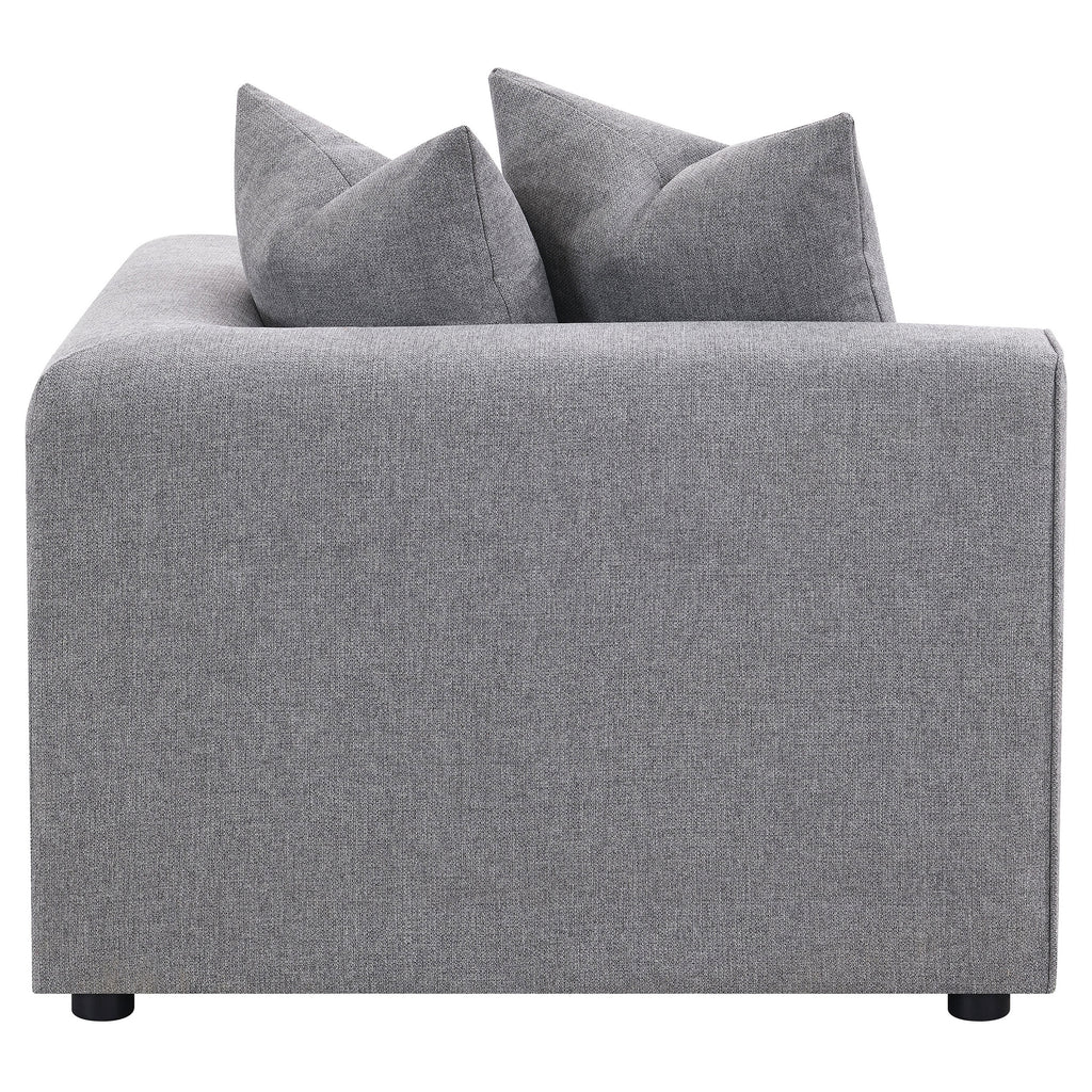Transform your modular sectional into a L-shaped configuration with this clean and contemporary modular corner chair. With a low-profile design of a track style backrest that doubles as arms, this modular corner chair caps one end of a long sectional sofa and bridges together two main pieces. The tailored tight seat is accented with welt trim along the upper edge. Lending a neutral color palette to enhance with decorative pillows or leave to its sophisticated tone, a soft grey woven fabric brings it all together. Matching pillows offers a plush backing to soften the hard line track back design.