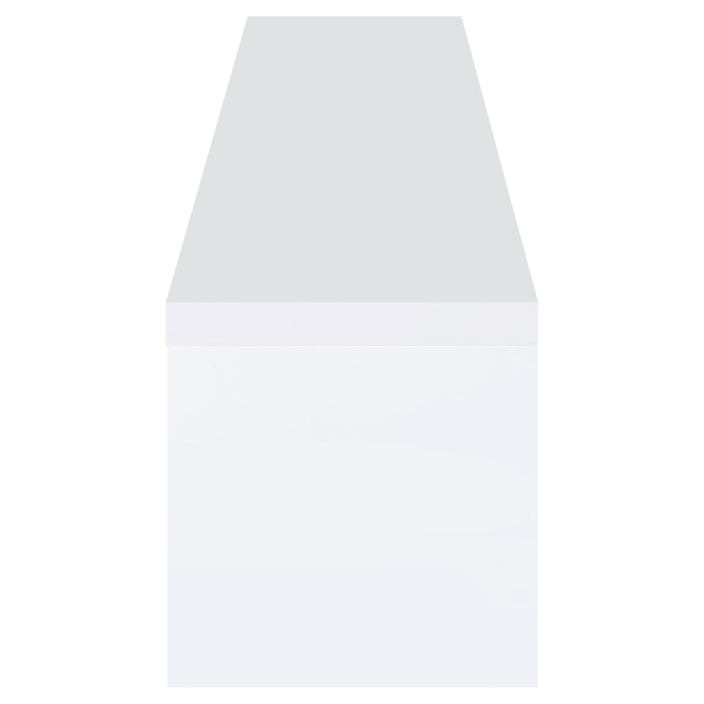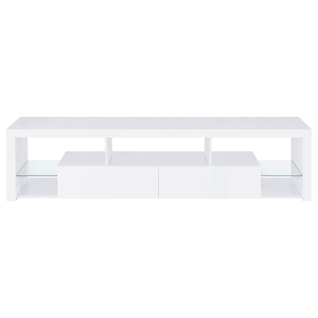 Sleek, modern TV stand with pristine glossy white finish and clear glass accents