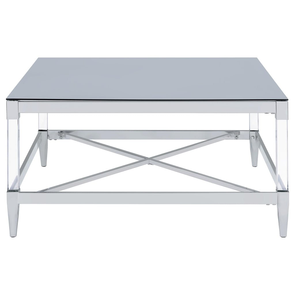 Transform your living room with this coffee table set, a stunning combination of mirrored tempered glass tops and chrome-electroplated frames. The coffee table and end table feature square tops that reflect light and color, creating vibrant focal points. Clear acrylic leg posts add an airy, floating aesthetic, while tapered feet provide stability and elegance. Designed for modern interiors, this set combines contemporary artistry with practical functionality.
