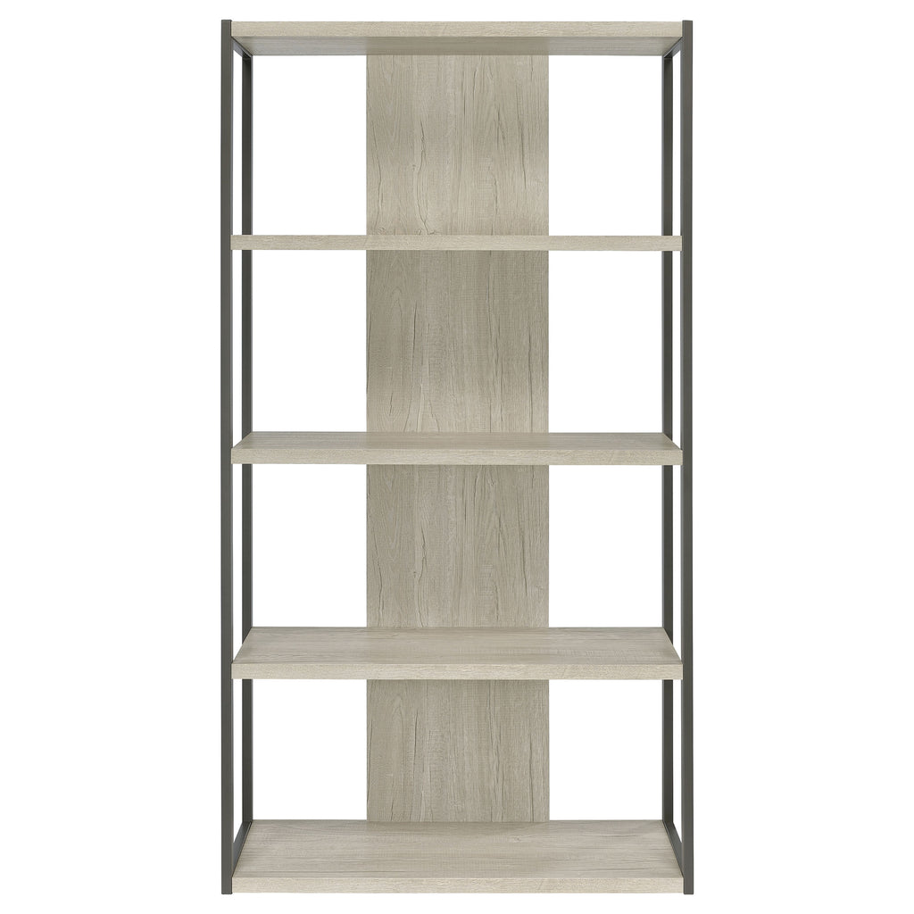 Showcase your favorite books and decor on this open and airy, tall contemporary bookcase, designed with four slim whitewashed grey shelves suspended by a bold grey finished frame. The back support and flush bottom shelf offers stability against area rugs and flooring.
