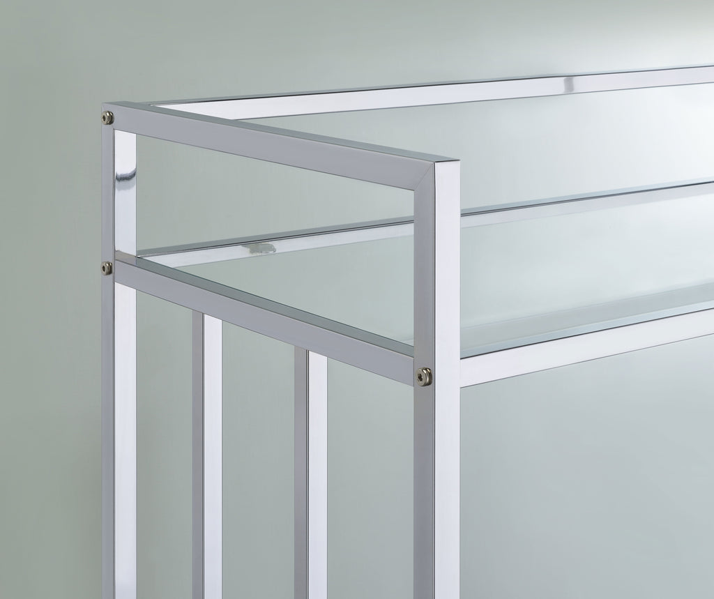 Welcome guests and serve up libations with this sleek contemporary bar cart. A rectangular silhouette outlined in a slim, square metal frame lends an Art Deco-inspired aesthetic to dining spaces and more. The polished, metallic finish elevates it even further, pushing the modern glam expression. Slide this luxe bar cart against a wall or glide it into the next room as you host parties, with the help of its lockable caster wheels. Two clear tempered glass shelves allow you to showcase your favorite bottles and barware.