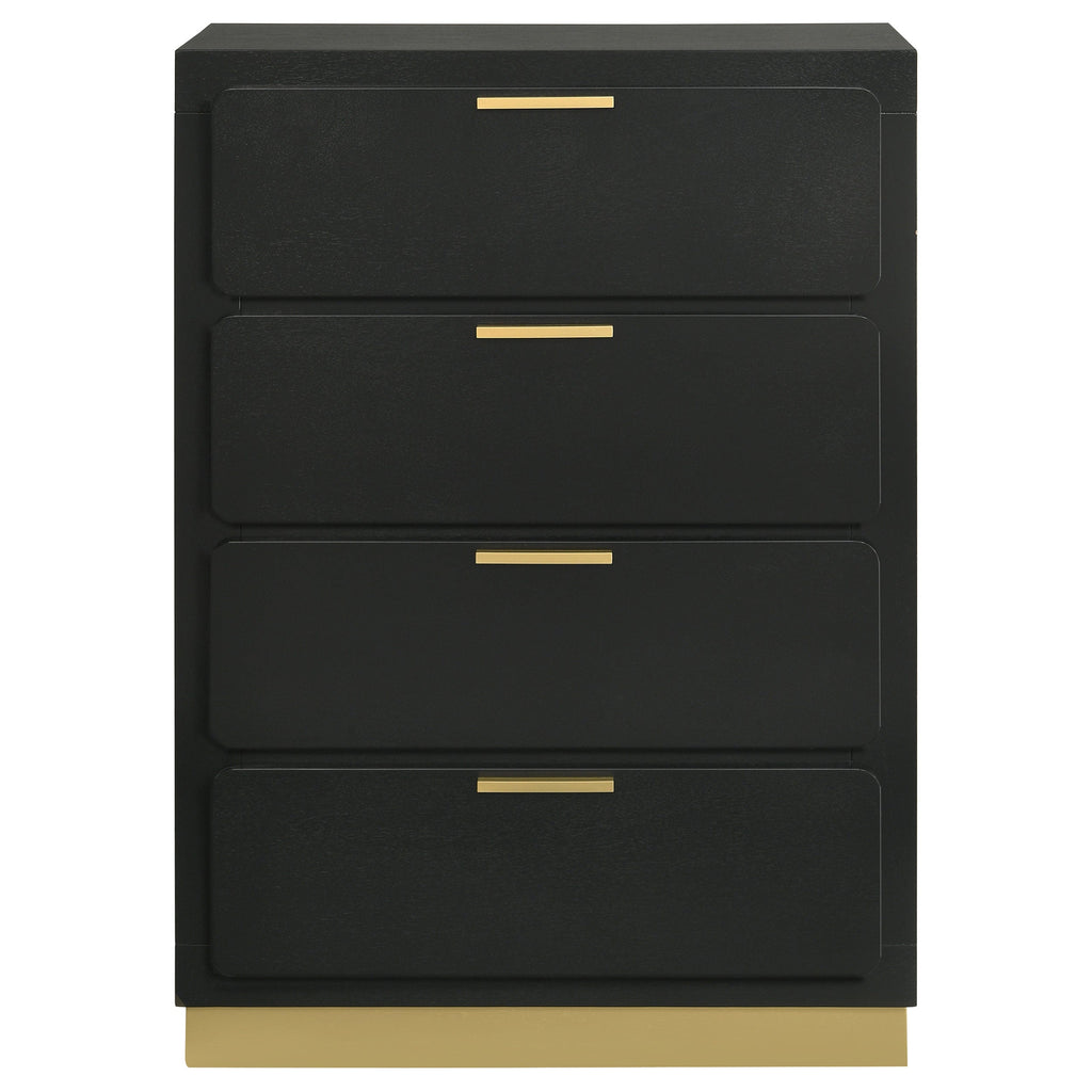 Modern luxury with a minimalist look offers a perfect fit for updated bedrooms as the four-drawer chest enhances a sleek master suite or guest bedroom. Wood and wood products construct a dresser with clean lines and a stylish Mid-Century Modern vibe. This chest offers simplicity with sleek elegance, as accents include straight drawer handles and a matching base. Spacious drawers operate smoothly on center drawer glides. Choose this chest for its versatility and convenience, accompanying either matching or coordinating pieces to pull a statement-making look together.