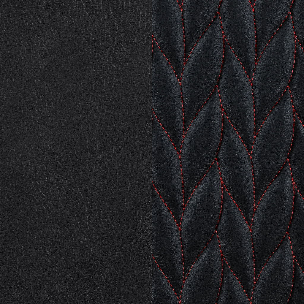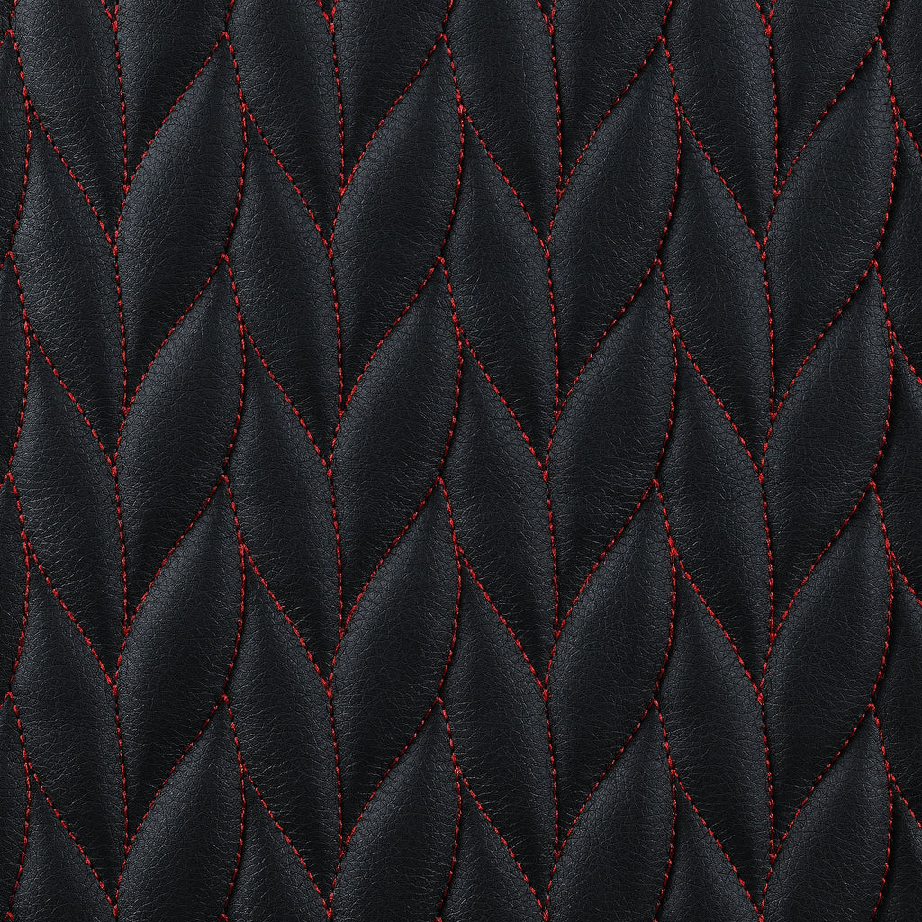 Contemporary office chair wrapped in black leatherette with botanical-inspired herringbone pattern and red stitching details for a bold statement piece
