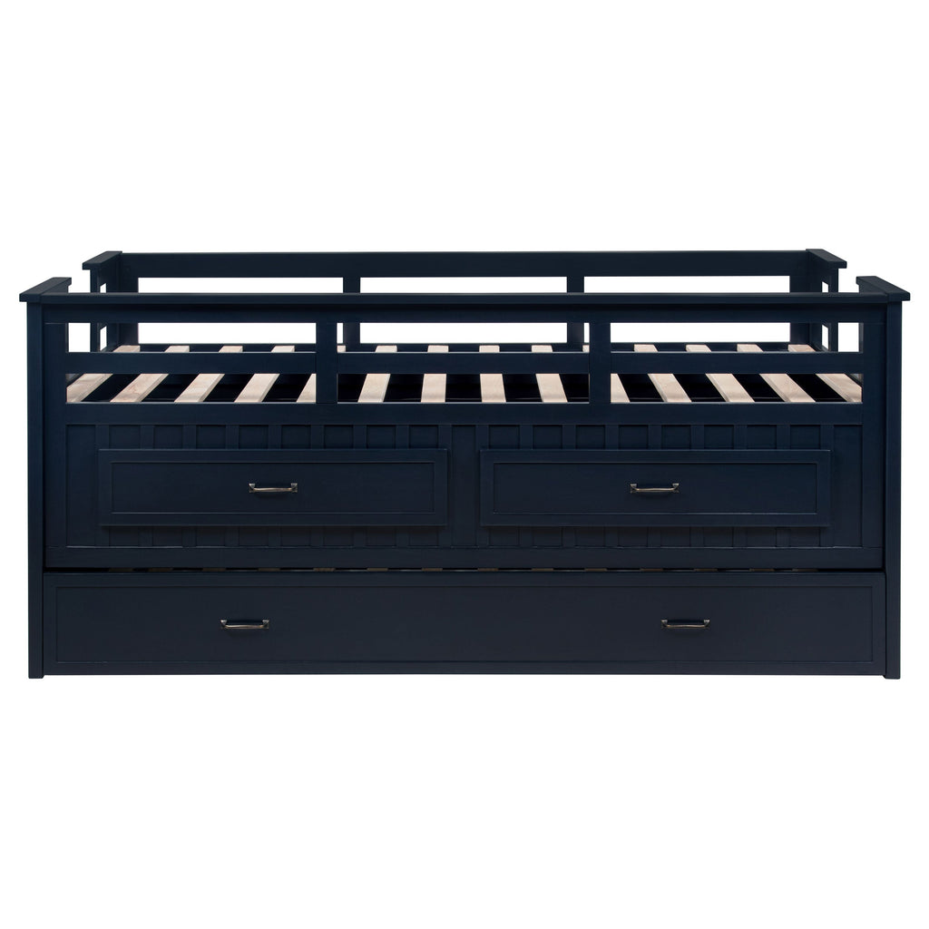 This captain's bed delivers a practical and stylish solution for children's rooms or compact spaces. Crafted from pine wood, plywood, and MDF, it features guardrails for added safety, a built-in ladder for easy access, and a bold finish that enhances its modern look. Two spacious drawers with smooth-gliding tracks keep essentials within easy reach, while the included slat kit ensures a durable, mattress-ready frame without the need for a box spring. Designed to maximize both style and functionality, this bed is perfect for versatile living.