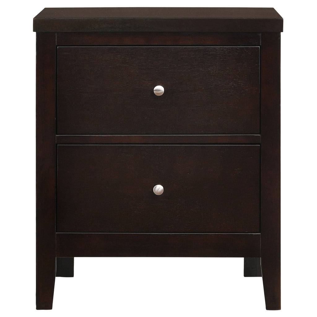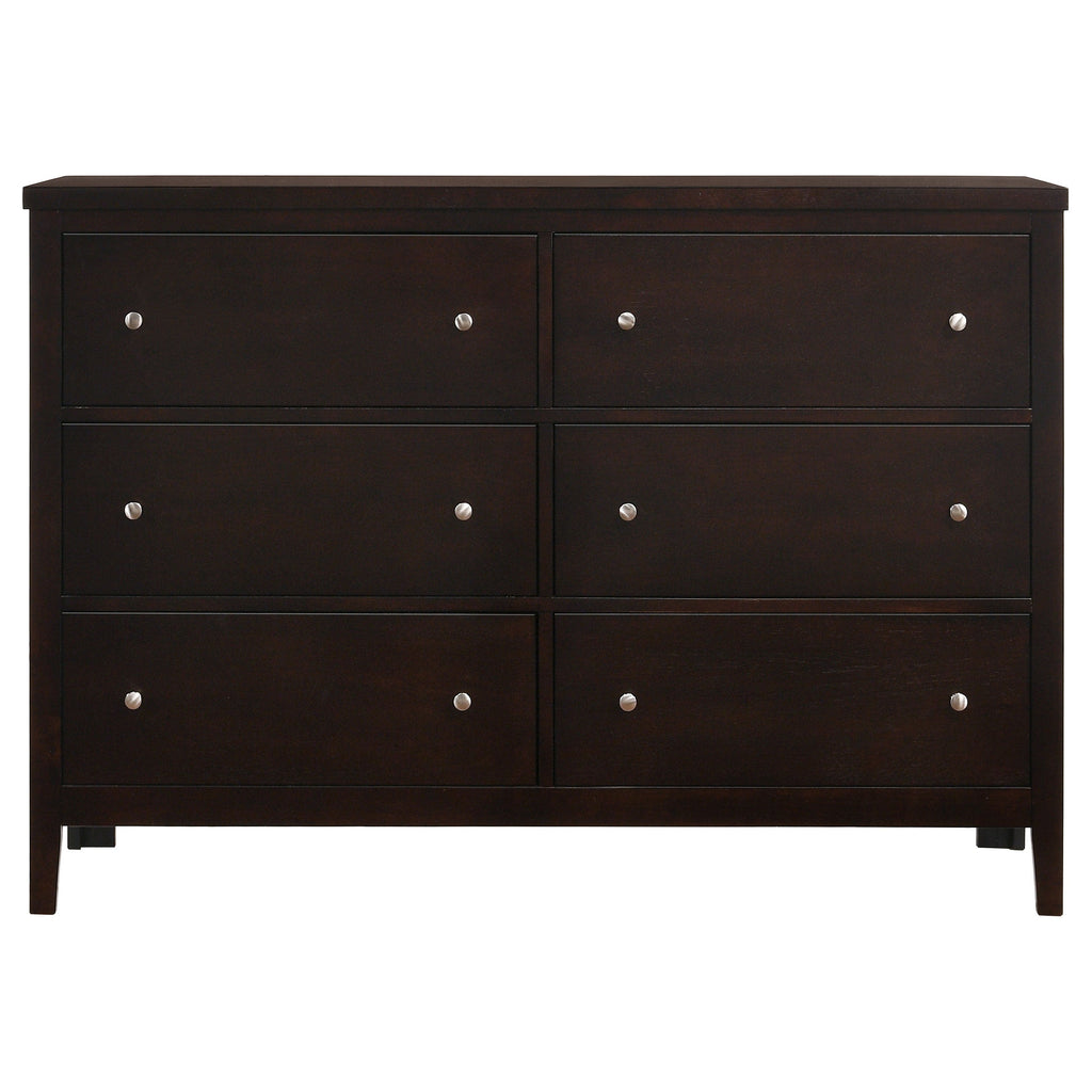 The Carlton collection is highlighted by this impressive 4-piece bedroom set that features black leatherette padding throughout. The high headboard and low footboard of the bed have vertical leatherette padded paneling for sumptuous style and majesty. The nightstand has two deep drawers and a table top for a matching table lamp. The dresser includes six deep drawers and a spacious top for the nearly-square mirror, which features padded leatherette on its top. The black leatherette of the set is handsomely offset by a warm cappuccino finish.