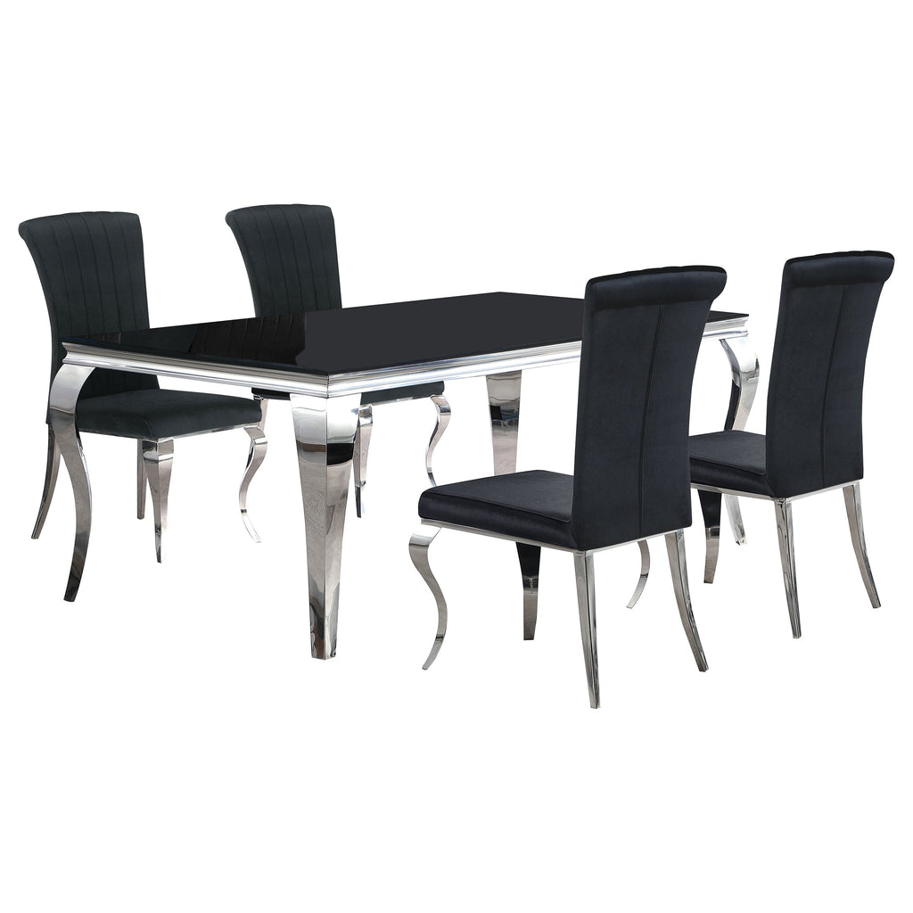 Experience the Carone dining set, seamlessly fusing modern design with timeless elements. The table's stainless steel legs bring sophistication, curving artistically and contrasting the 12mm tempered glass top with beveled edges. Hosting formal feasts is effortless on this table. Complementing this, the elegant dining chairs exude sleek sophistication. Their chrome-finished legs, including creatively curved front legs, offer a captivating shine. Luxe velvet upholstery graces the seats, available in various colors to personalize your space. Elevate your dining area with the Carone collection, where innovation meets opulence.