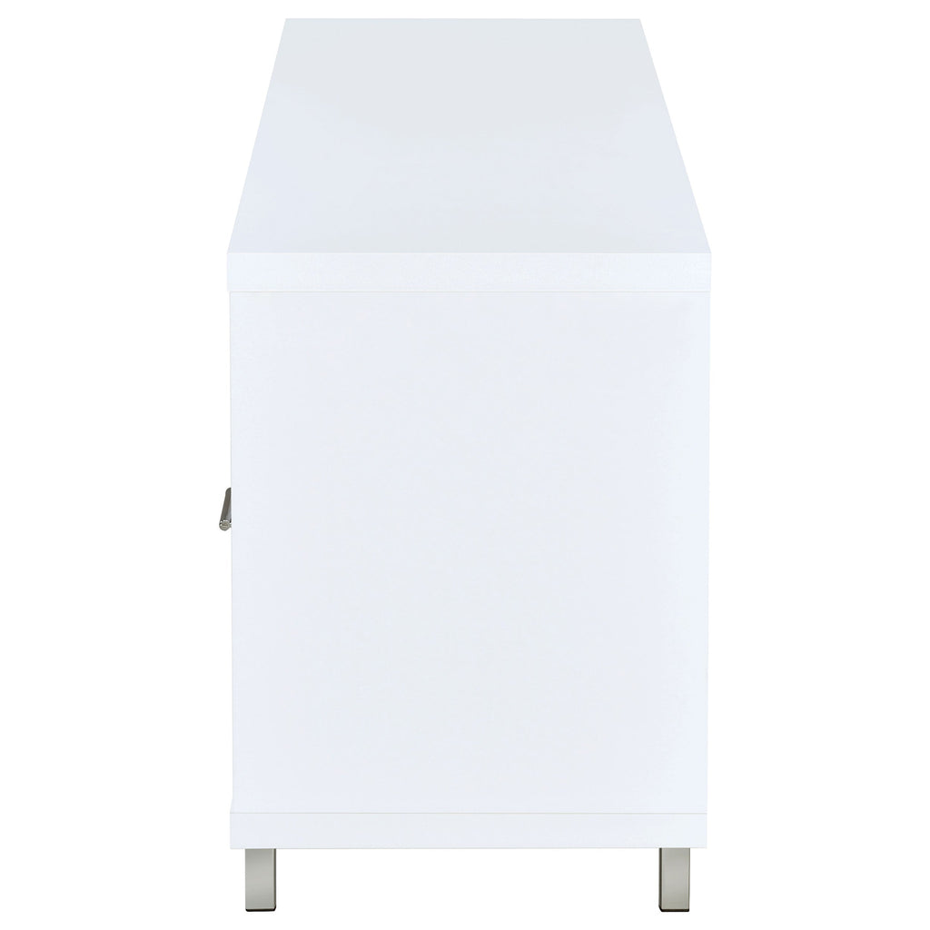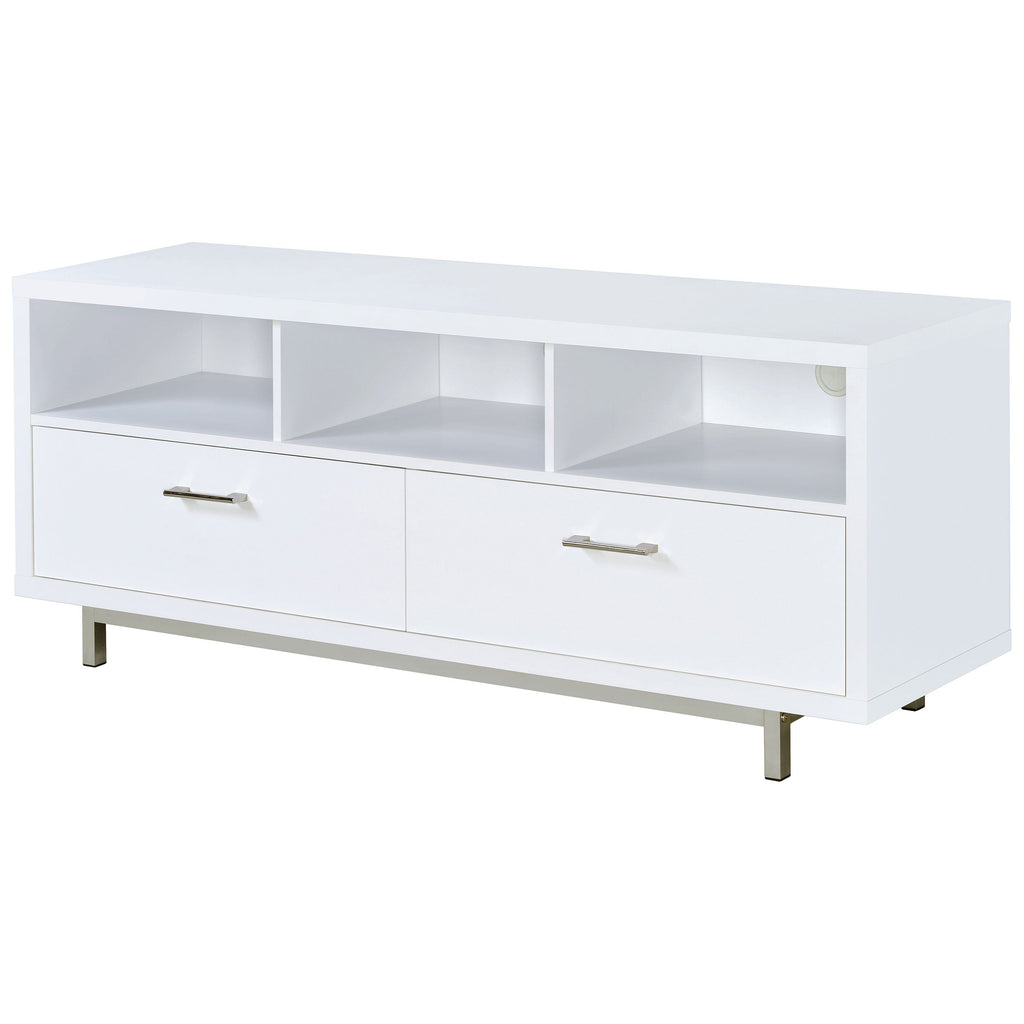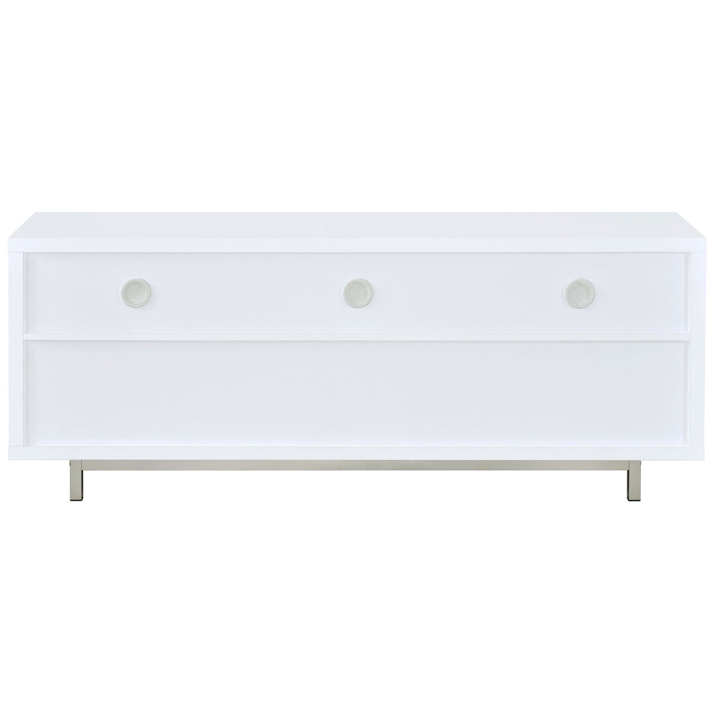 Update your space with glamour and grace. This TV console has a bold, stylish appearance that enhances any living room. A brushed silver frame and high-shine chrome hardware add a posh, polished accent to its strong silhouette. Its large storage area includes two large drawers and three open compartments, while top-quality craftsmanship keeps valuables safe and secure. This gorgeous console is available in your choice of white or cappuccino finishes, offering two attractive options to accentuate your personal style.