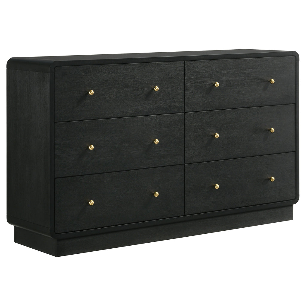 Reimagine your bedroom entirely with the sophistication of a modern bedroom set. It focuses on a chic upholstered bed that features a pair of padded panels with charcoal fabric that creates a soft, inviting presence that's perfect for lounging while maintaining a refined look. Storage pieces add ample space for organization. The dresser includes a mirror that lightens the look and provides reflectivity and a place for beauty rituals. A black finish is paired with old finish hardware, creating a touch of glam allure perfect for a sophisticated bedroom.
