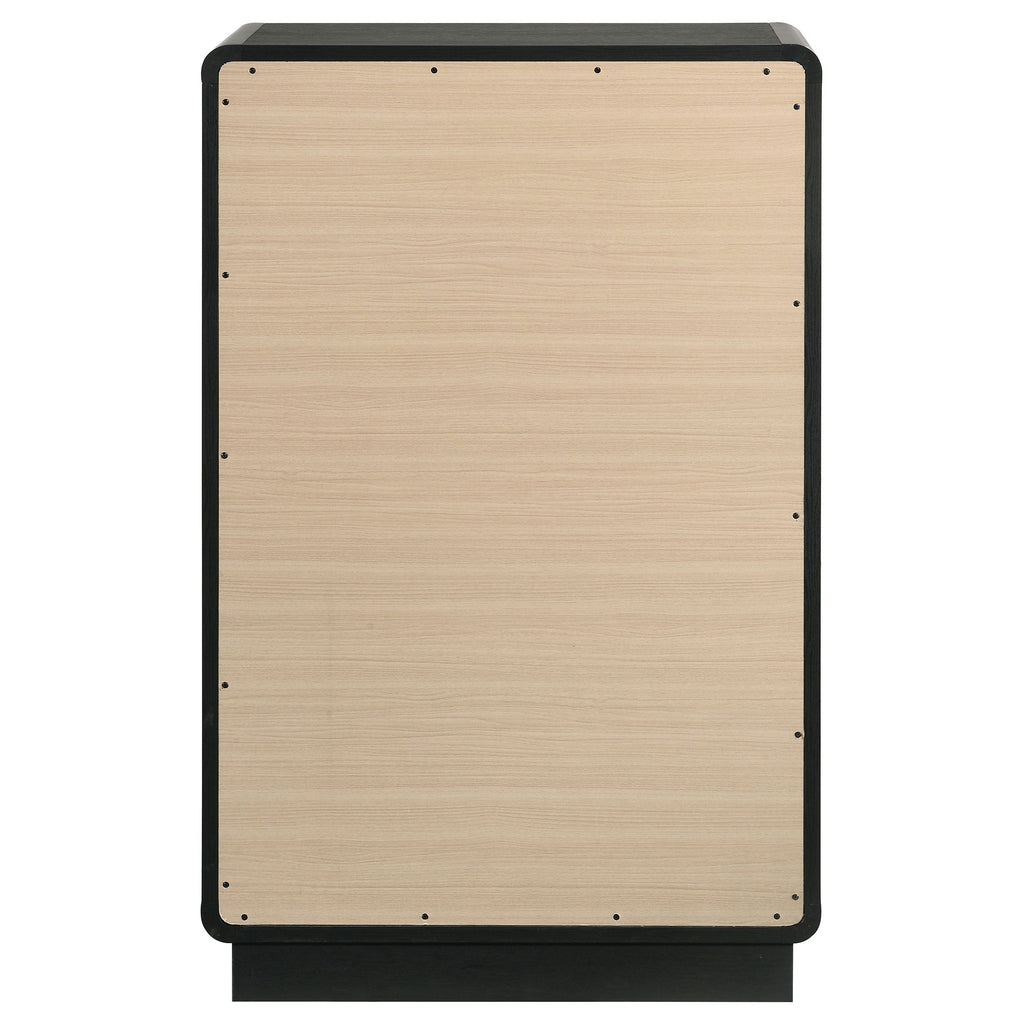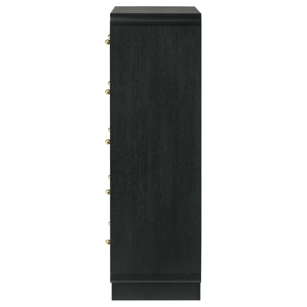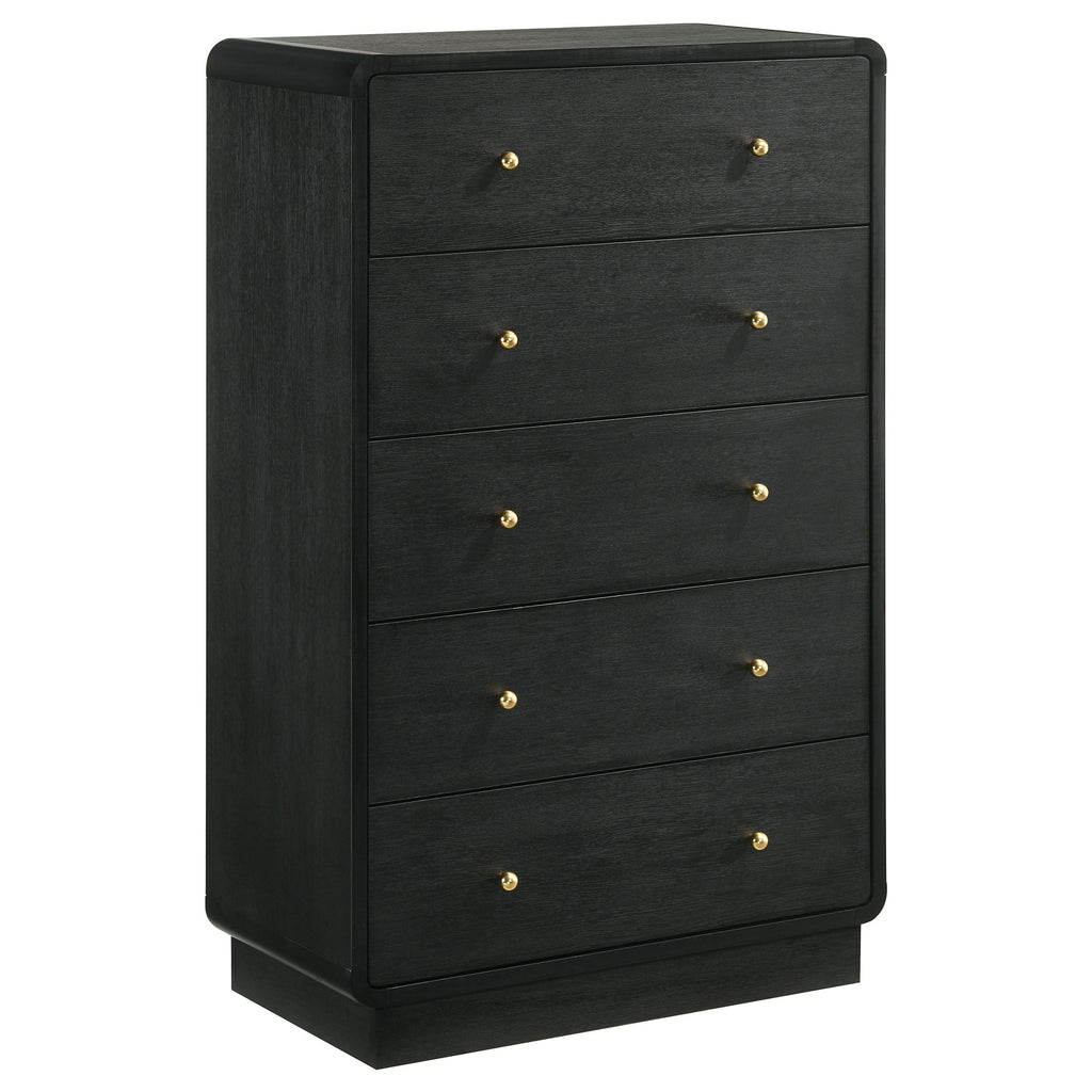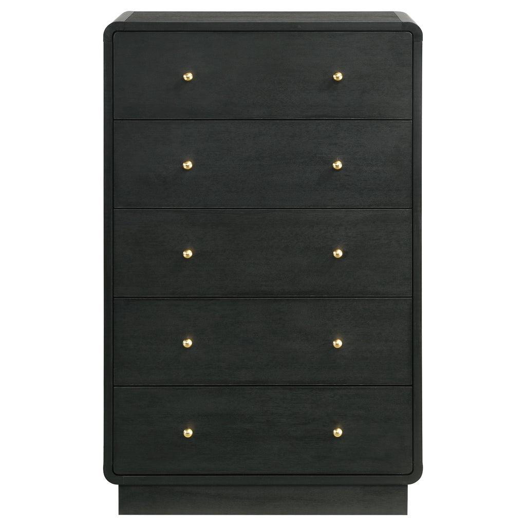 Create a dedicated space for clothing and accessory storage with this modern five-drawer chest. Its sophisticated presentation is complemented with a black finish over durable melamine surfaces, resisting damage to maintain its fresh, clean aesthetics. Each drawer front is dotted with a pair of ball knobs, offering seamless performance and a refined, glam touch of character. The chest features a rounded silhouette, softening the dark black finish, while adding to its modern appeal. Add art to its roomy top to create a truly eye-catching accent piece in your bedroom.
