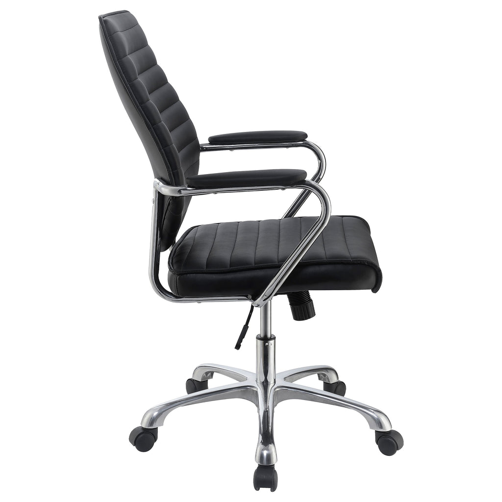 Cool, classy, and comfy, this office chair has it all. A tall, wide back combines with a padded seat and armrests to ensure maximum comfort and stability. Its swivel base is complete with casters, allowing you to move around with ease. Its seat is embellished with sleek, straight lines for an added touch of style. Constructed with high-quality aluminum, this versatile chair offers superior support and durability.
