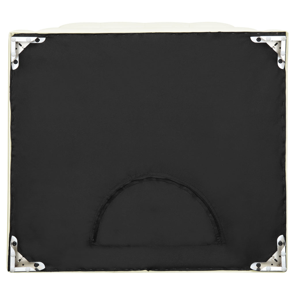 Chic barely begins to describe this decor gem. Styled to impress, this ottoman reflects a cool Art Deco motif. Revisit designs from eras past with a low-profile ottoman wrapped in fresh pearl white leatherette. Quilted detailing joins chrome doorknocker handles and chrome legs for a vibrant accent effect. Make this ottoman part of a stylish retro themed space.