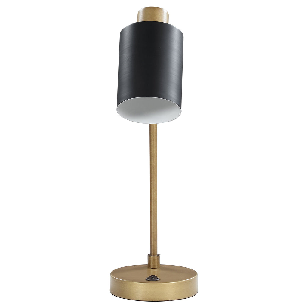 Upgrade your desk or nightstand with the charming style and energy efficient lighting of a modern metal LED table lamp. The classic design is updated for an on-trend look, pairing graceful curves with a minimalist look. The cylindrical metal shade houses a 2-watt bulb that's energy efficient and perfect for tasks. The shade receives a matte black finish that provides the perfect contrast to a lovely antique brass bold finish. Warm and welcoming, this desk lamp is the perfect choice for a refined library, den, or home office.