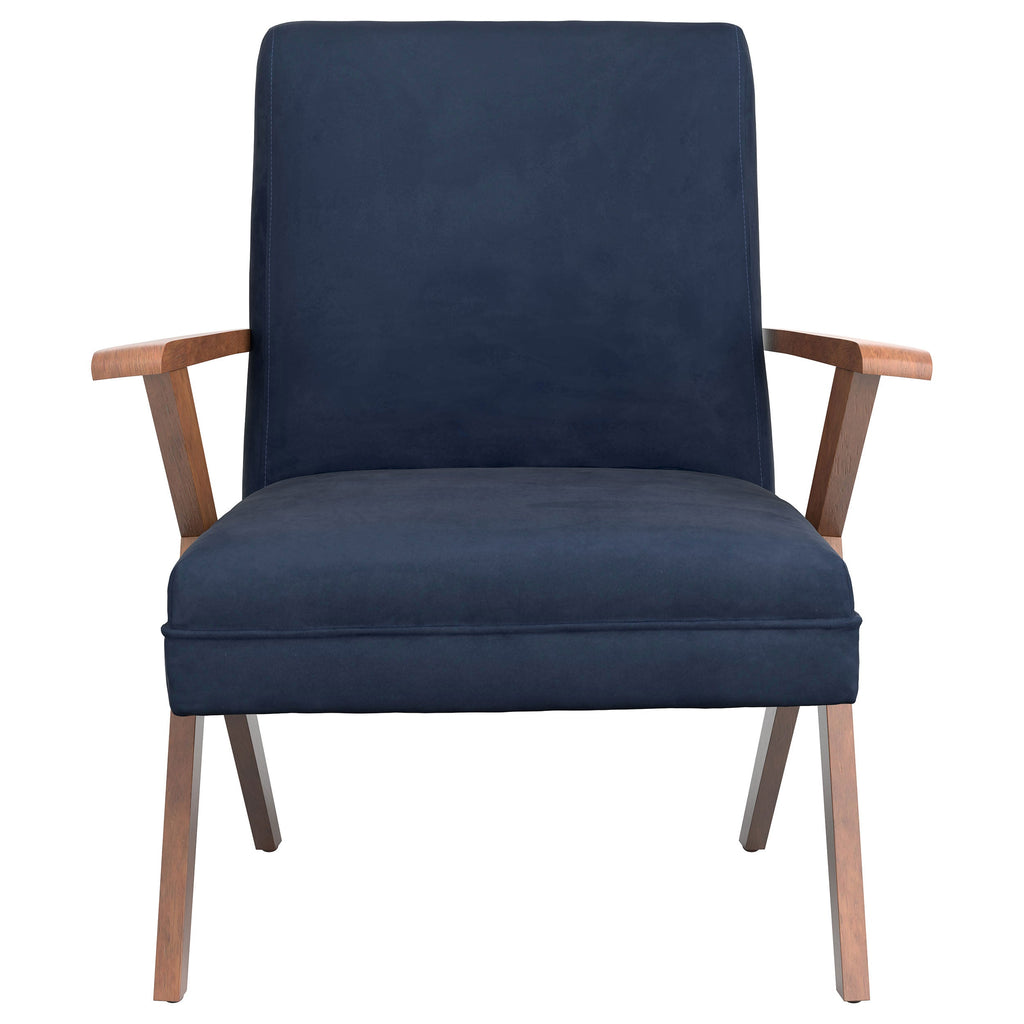 Go bold in both tones and silhouette when you add this fabric accent chair to your home. Chair is upholstered in soft dark blue fabric. Padded seat and back cushions provide hours of comfort. Rich brown armrests and legs offer warmth and support. It's a bold, handsome addition to your living room or den.