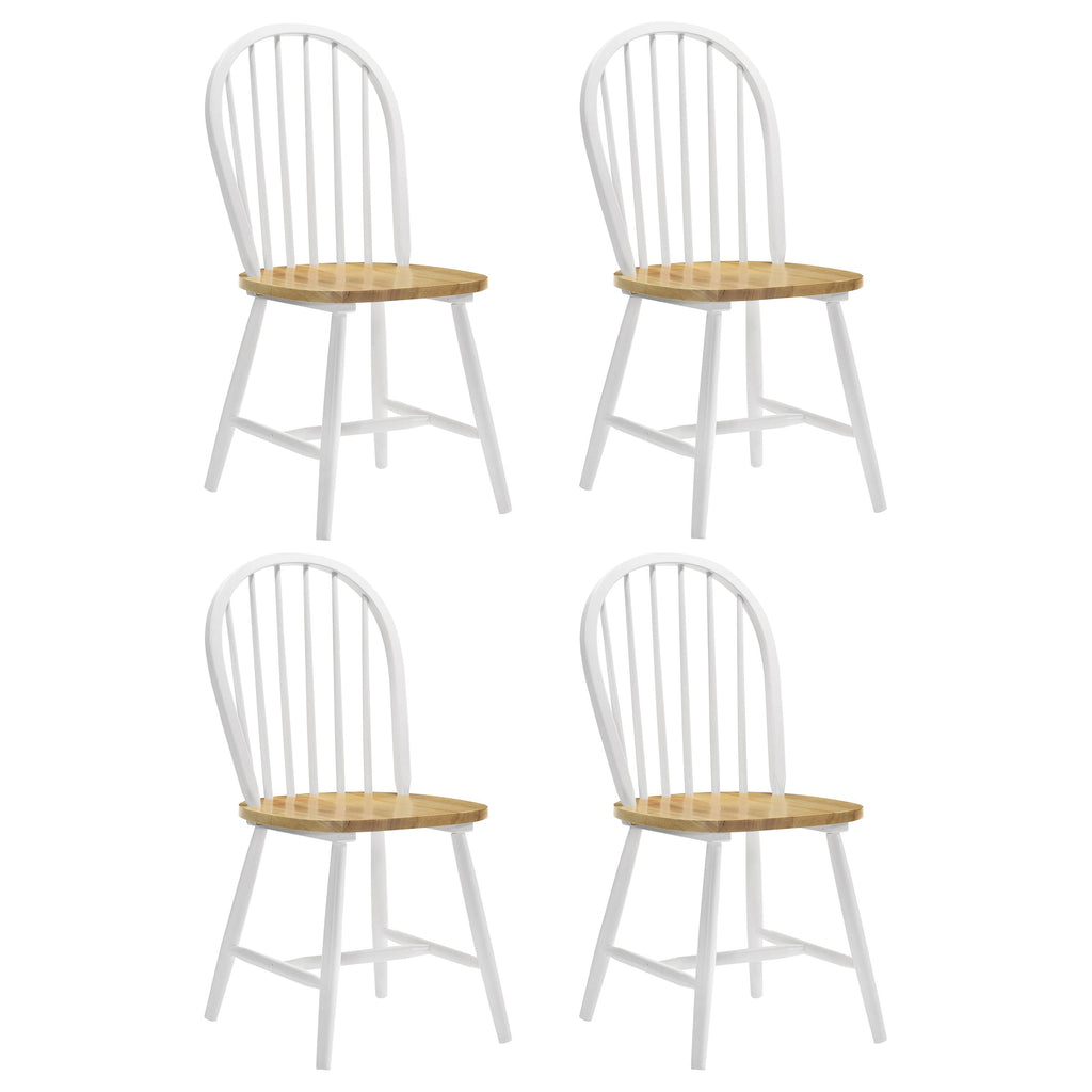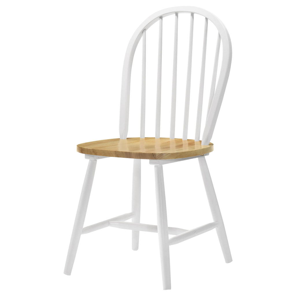 A timeless design meets everyday functionality with this classic Windsor-style side chair. Crafted from a blend of solid rubberwood and engineered wood, it offers durability and charm for casual dining spaces. The arched spindle backrest provides gentle support, while the contoured seat ensures comfort. A two-tone white and natural brown finish enhances its traditional appeal, making it a versatile addition to farmhouse, cottage, or transitional dining areas.
