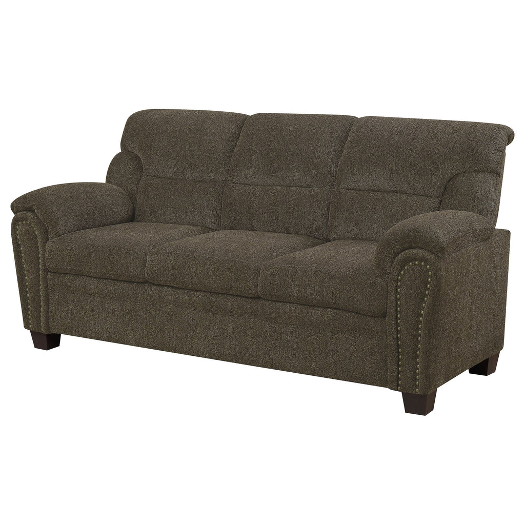 Add an aesthetic of cool, classic glamour to your living room. This sofa boasts a transitional design that looks lovely in any space. Its silhouette is sleek and simple with gracefully curved arms. Its beautiful upholstery is brought to life by elegant nailhead trim. Its seating is pleasingly soft and plush, rounding out its casual design with a high level of comfort.